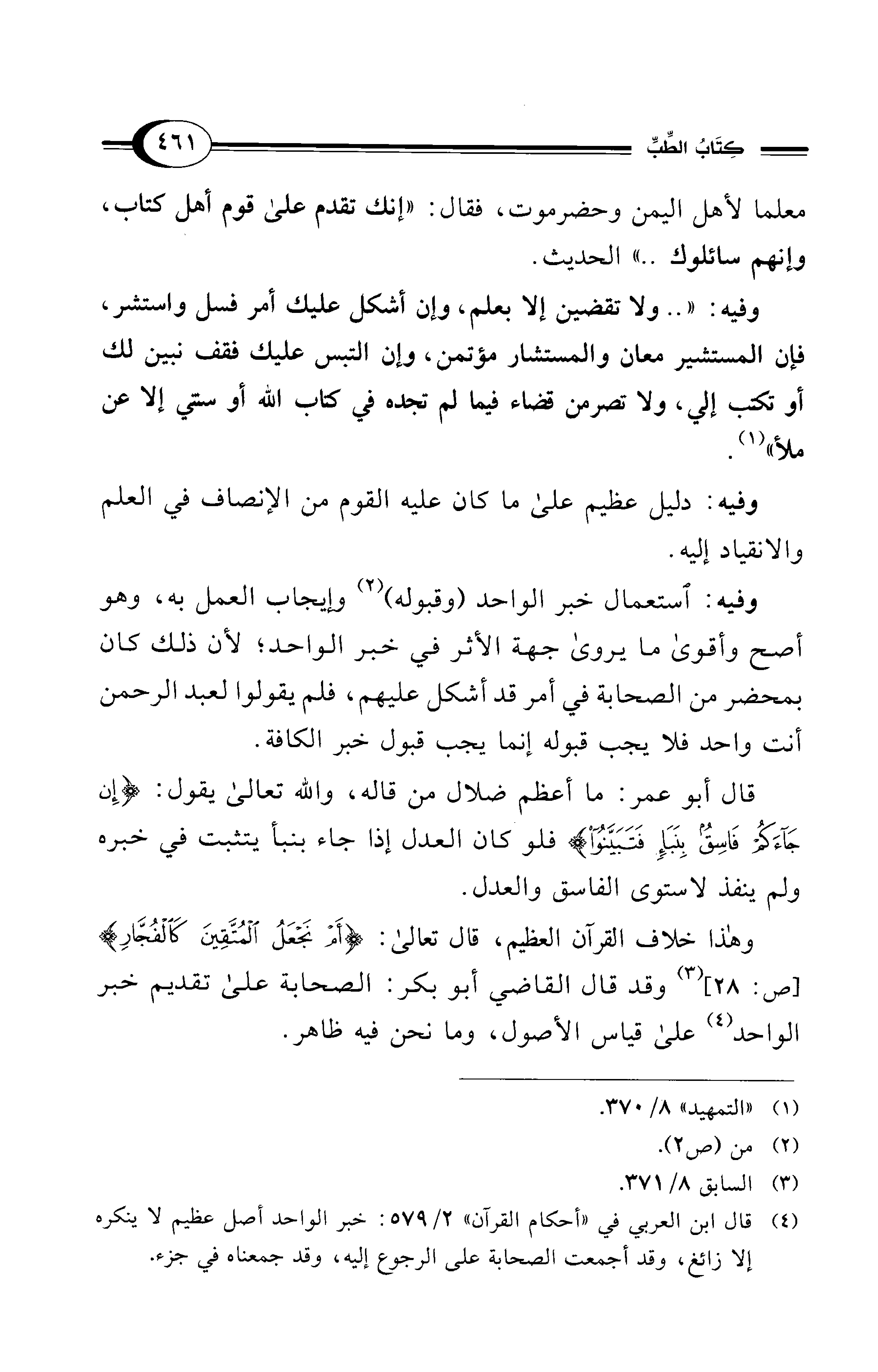 (¬4) قال ابن العربي في "أحكام القرآن" 2/ 579: خبر الواحد أصل عظيم لا ينكره إلا زائغ، وقد أجمعت الصحابة على الرجوع إليه، وقد جمعناه في جزء.
