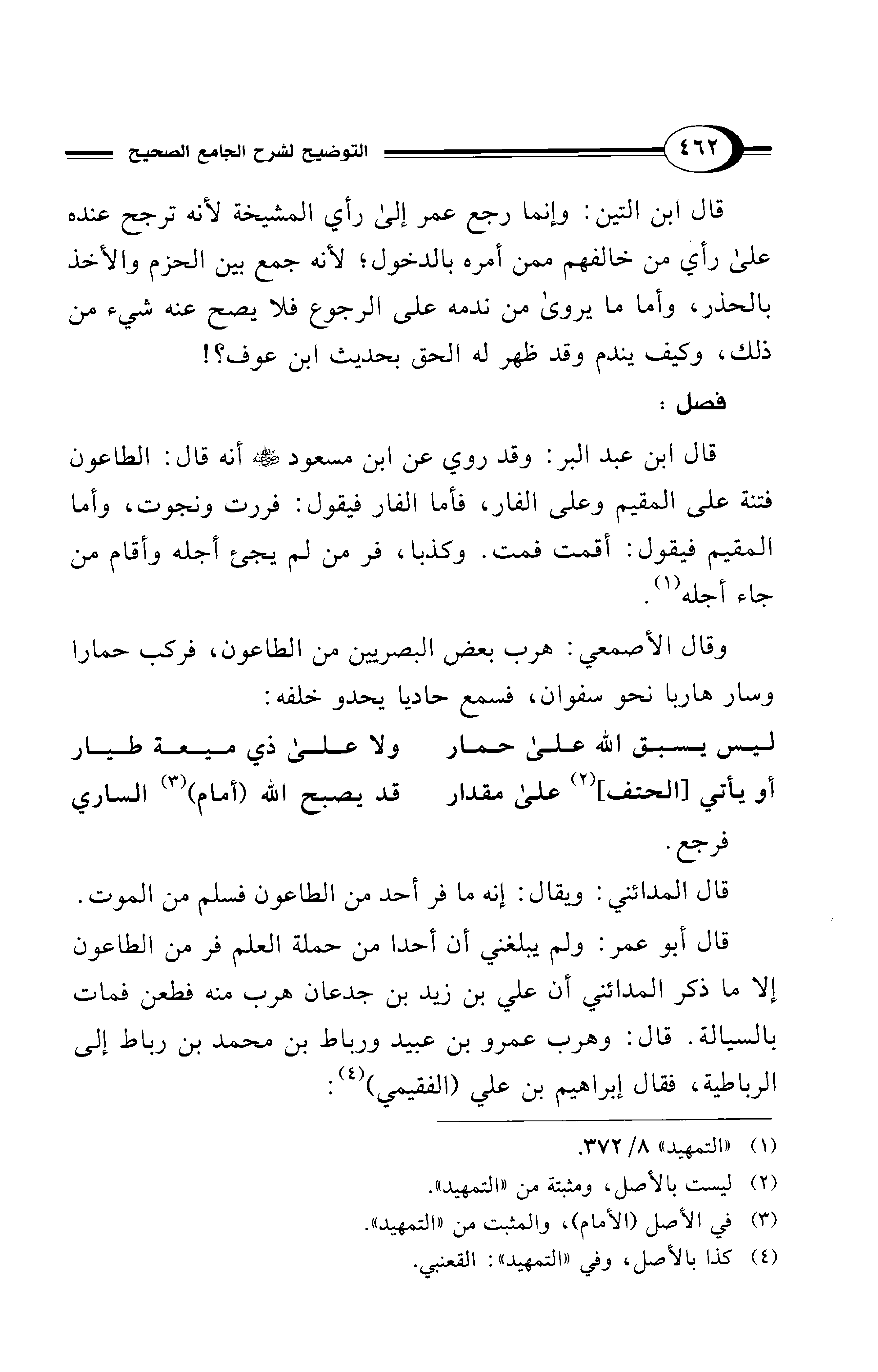 قال أبو عمر: ولم يبلغني أن أحدا من حملة العلم فر من الطاعون إلا ما ذكر المدائني أن علي بن زيد بن جدعان هرب منه فطعن فمات بالسيالة. قال: وهرب عمرو بن عبيد ورباط بن محمد بن رباط إلى الرباطية، فقال إبراهيم بن علي (الفقيمي) (¬4):