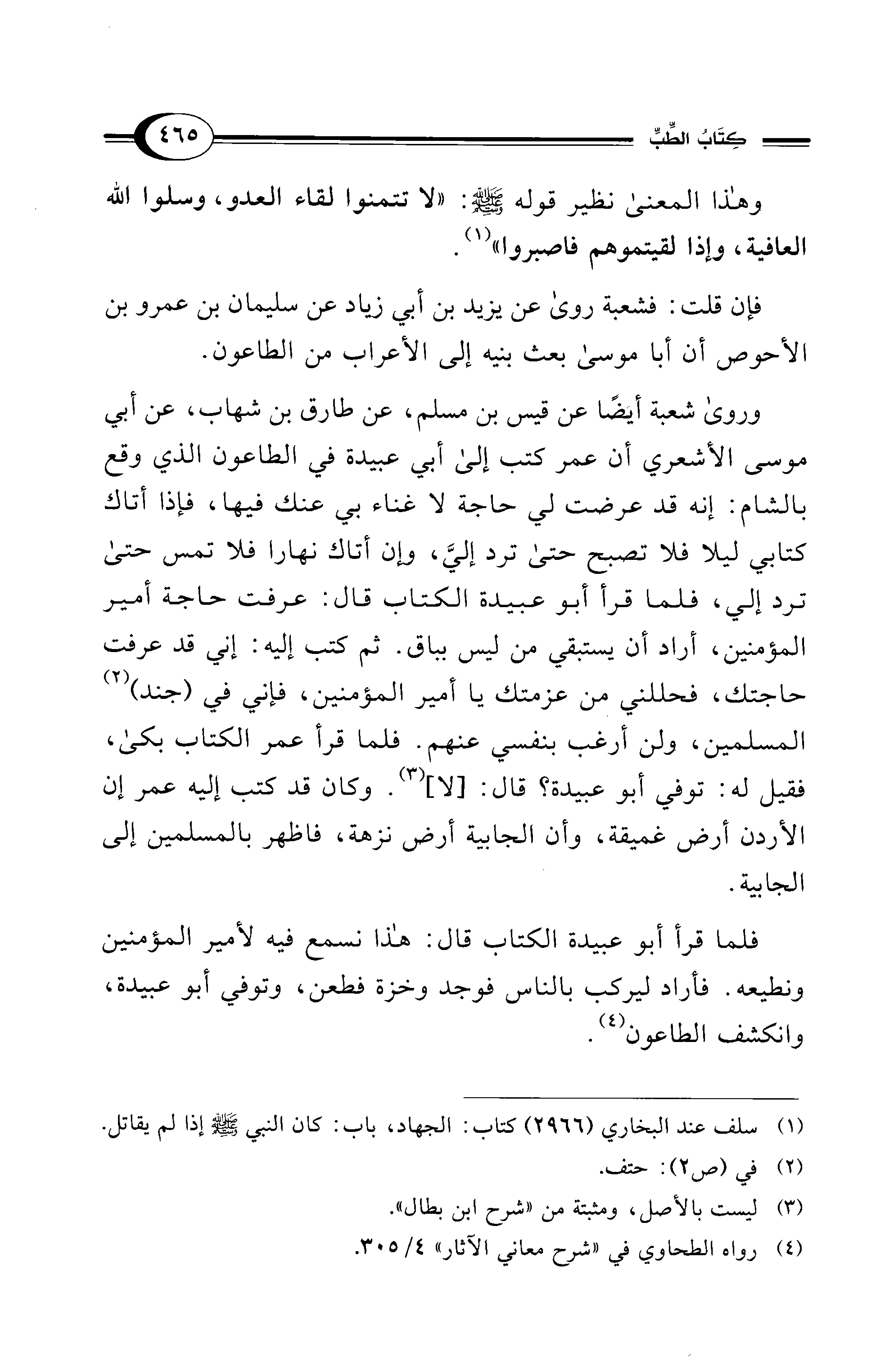 وروى شعبة أيضًا عن قيس بن مسلم، عن طارق بن شهاب، عن أبي موسى الأشعري أن عمر كتب إلى أبي عبيدة في الطاعون الذي وقع بالشام: إنه قد عرضت لي حاجة لا غناء بي عنك فيها، فإذا أتاك كتابي ليلا فلا تصبح حتى ترد إليَّ، وإن أتاك نهارا فلا تمس حتى ترد إلى، فلما قرأ أبو عبيدة الكتاب قال: عرفت حاجة أمير المؤمنين، أراد أن يستبقي من ليس بباق. ثم كتب إليه: إني قد عرفت حاجتك، فحللني من عزمتك يا أمير المؤمنين، فإني في (جند) (¬2) المسلمين، ولن أرغب بنفسي عنهم. فلما قرأ عمر الكتاب بكى، فقيل له: توفي أبو عبيدة؟ قال: [لا] (¬3). وكان قد كتب إليه عمر إن الأردن أرض غميقة، وأن الجابية أرض نزهة، فأظهر بالمسلمين إلى الجابية.