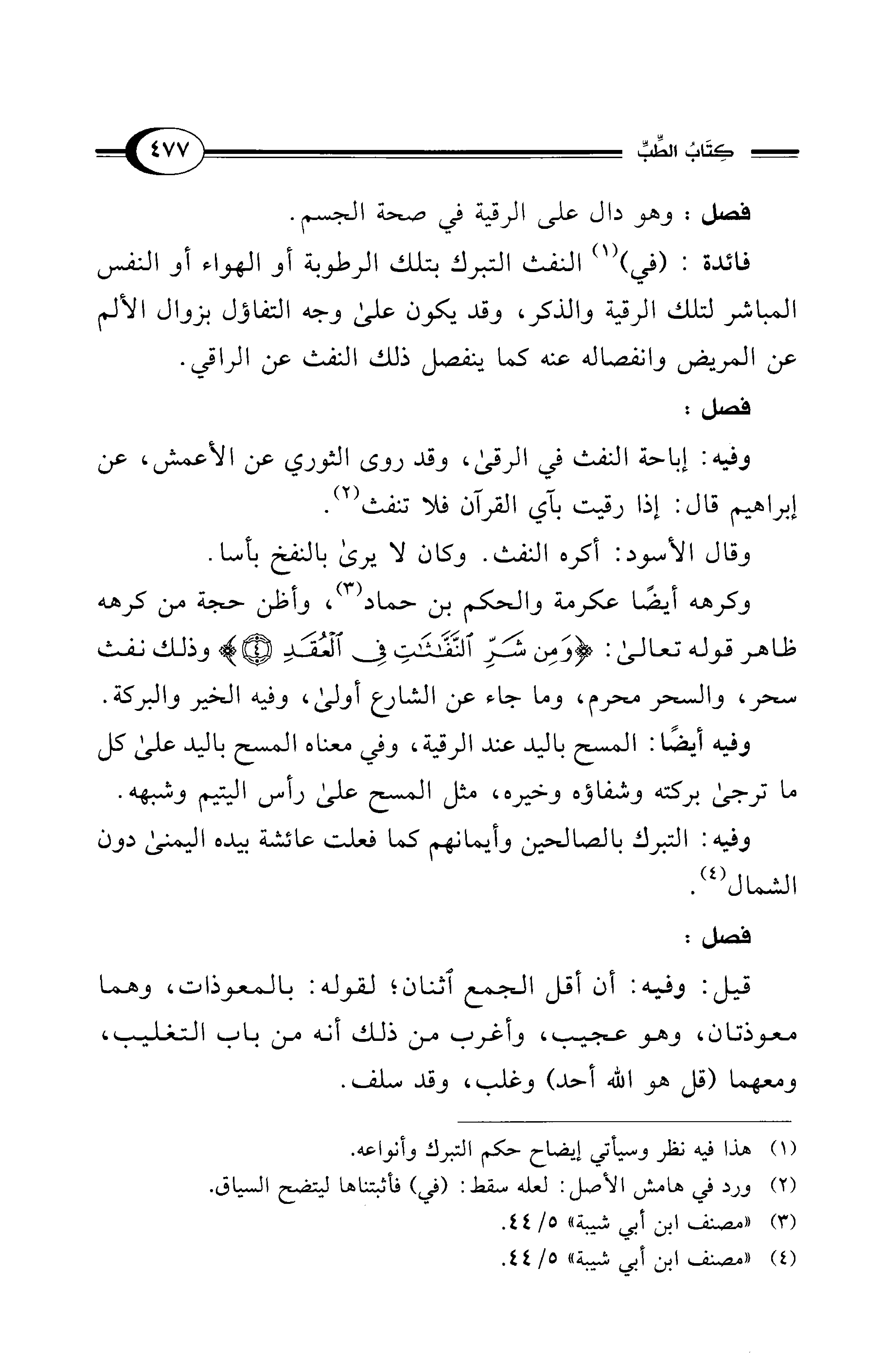 وكرهه أيضًا عكرمة والحكم بن حماد (¬3)، وأظن حجة من كرهه ظاهر قوله تعالى: {وَمِنْ شَرِّ النَّفَّاثَاتِ فِي الْعُقَدِ (4)} وذلك نفث سحر، والسحر محرم، وما جاء عن الشارع أولى، وفيه الخير والبركة.