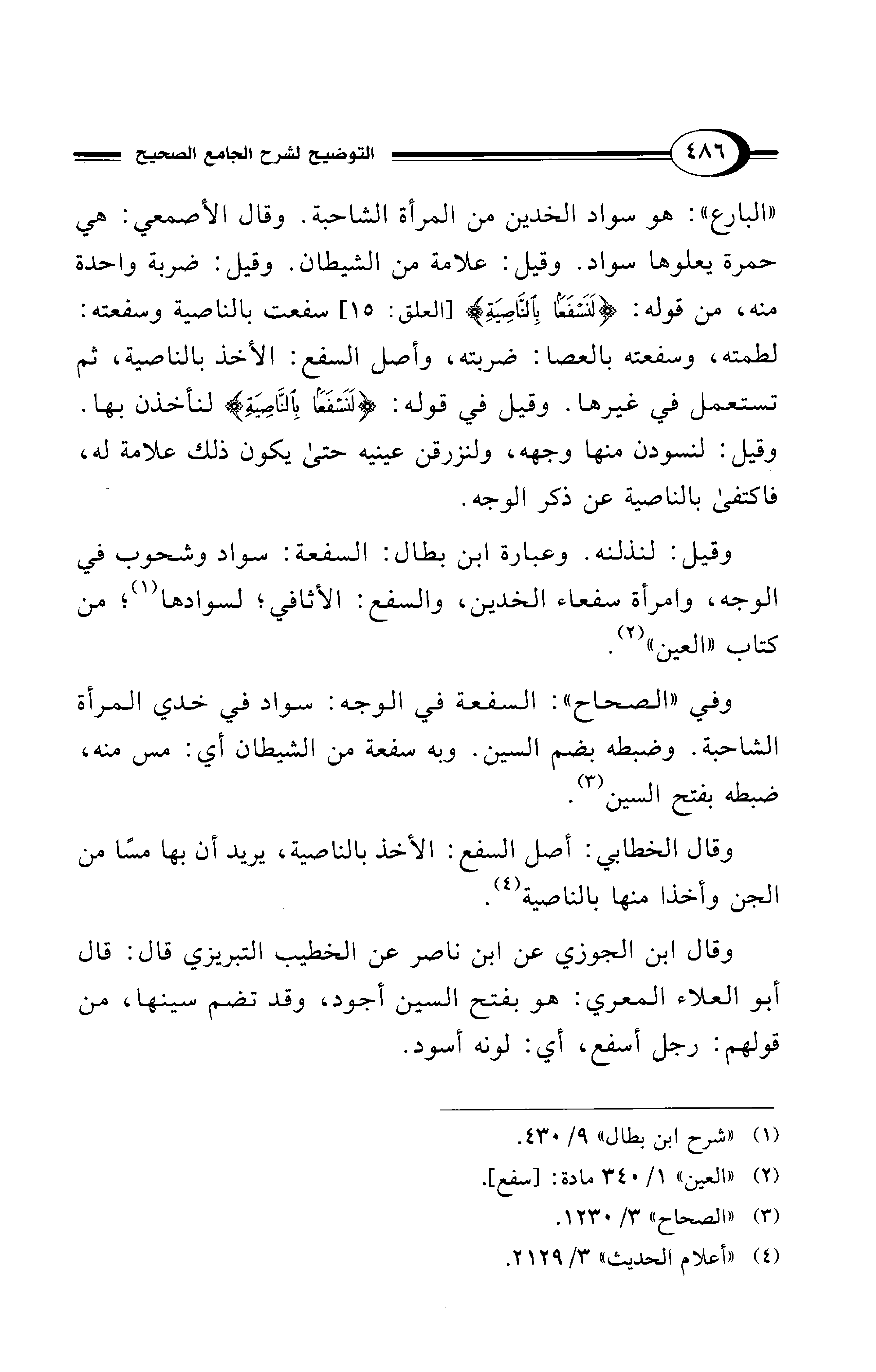 وفي "الصحاح": السفعة في الوجه: سواد في خدي المرأة الشاحبة. وضبطه بضم السين. وبه سفعة من الشيطان أي: مس منه، ضبطه بفتح السين (¬3).