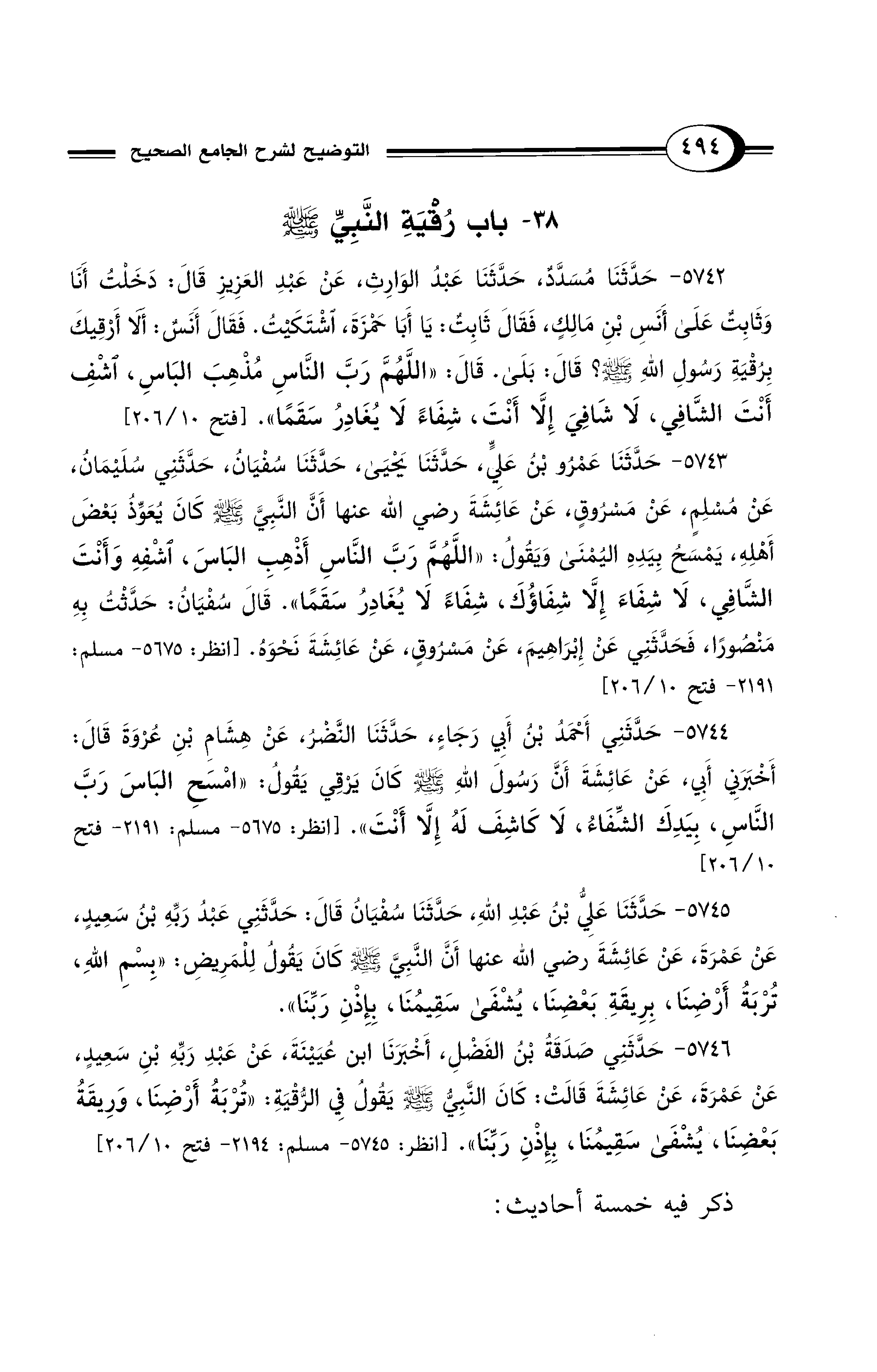 5744 - حَدَّثَنِي أَحْمَدُ بْنُ أَبِي رَجَاءٍ، حَدَّثَنَا النَّضْرُ، عَنْ هِشَامِ بْنِ عُرْوَةَ قَالَ: أَخْبَرَنِي أَبِي، عَنْ عَائِشَةَ أَنَّ رَسُولَ اللهِ - صلى الله عليه وسلم - كَانَ يَرْقِي يَقُولُ: «امْسَحِ الْبَاسَ رَبَّ النَّاسِ، بِيَدِكَ الشِّفَاءُ، لاَ كَاشِفَ لَهُ إِلاَّ أَنْتَ». [انظر: 5675 - مسلم: 2191 - فتح 10/ 206]