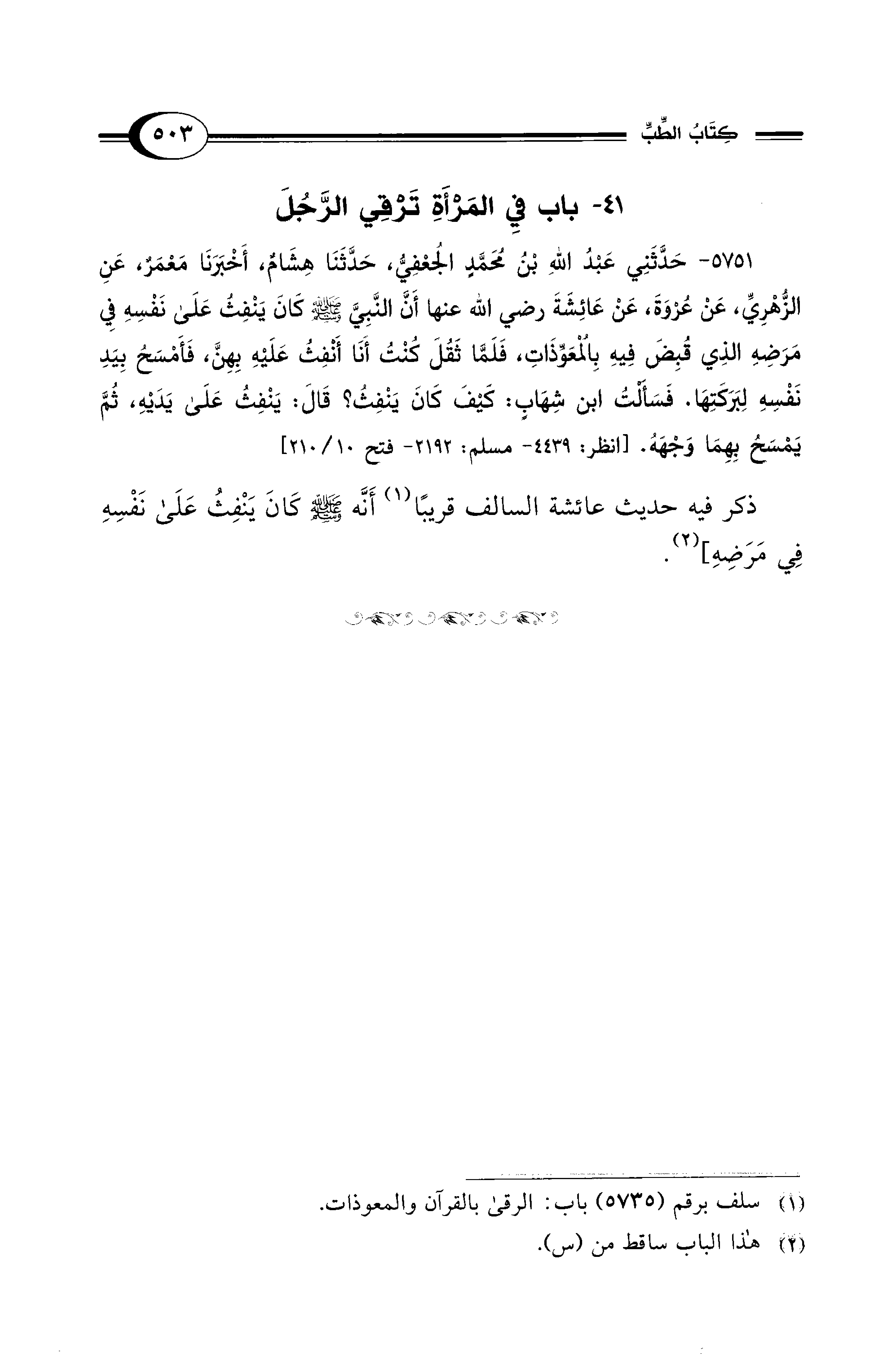 5751 - حَدَّثَنِي عَبْدُ اللهِ بْنُ مُحَمَّدٍ الْجُعْفِيُّ، حَدَّثَنَا هِشَامٌ، أَخْبَرَنَا مَعْمَرٌ، عَنِ الزُّهْرِيِّ، عَنْ عُرْوَةَ، عَنْ عَائِشَةَ - رضي الله عنها - أَنَّ النَّبِيَّ - صلى الله عليه وسلم - كَانَ يَنْفِثُ عَلَى نَفْسِهِ فِي مَرَضِهِ الَّذِي قُبِضَ فِيهِ بِالْمُعَوِّذَاتِ، فَلَمَّا ثَقُلَ كُنْتُ أَنَا أَنْفِثُ عَلَيْهِ بِهِنَّ، فَأَمْسَحُ بِيَدِ نَفْسِهِ لِبَرَكَتِهَا. فَسَأَلْتُ ابْنَ شِهَابٍ: كَيْفَ كَانَ يَنْفِثُ؟ قَالَ: يَنْفِثُ على يَدَيْهِ، ثُمَّ يَمْسَحُ بِهِمَا وَجْهَهُ. [انظر: 4439 - مسلم: 2192 - فتح 10/ 210]
