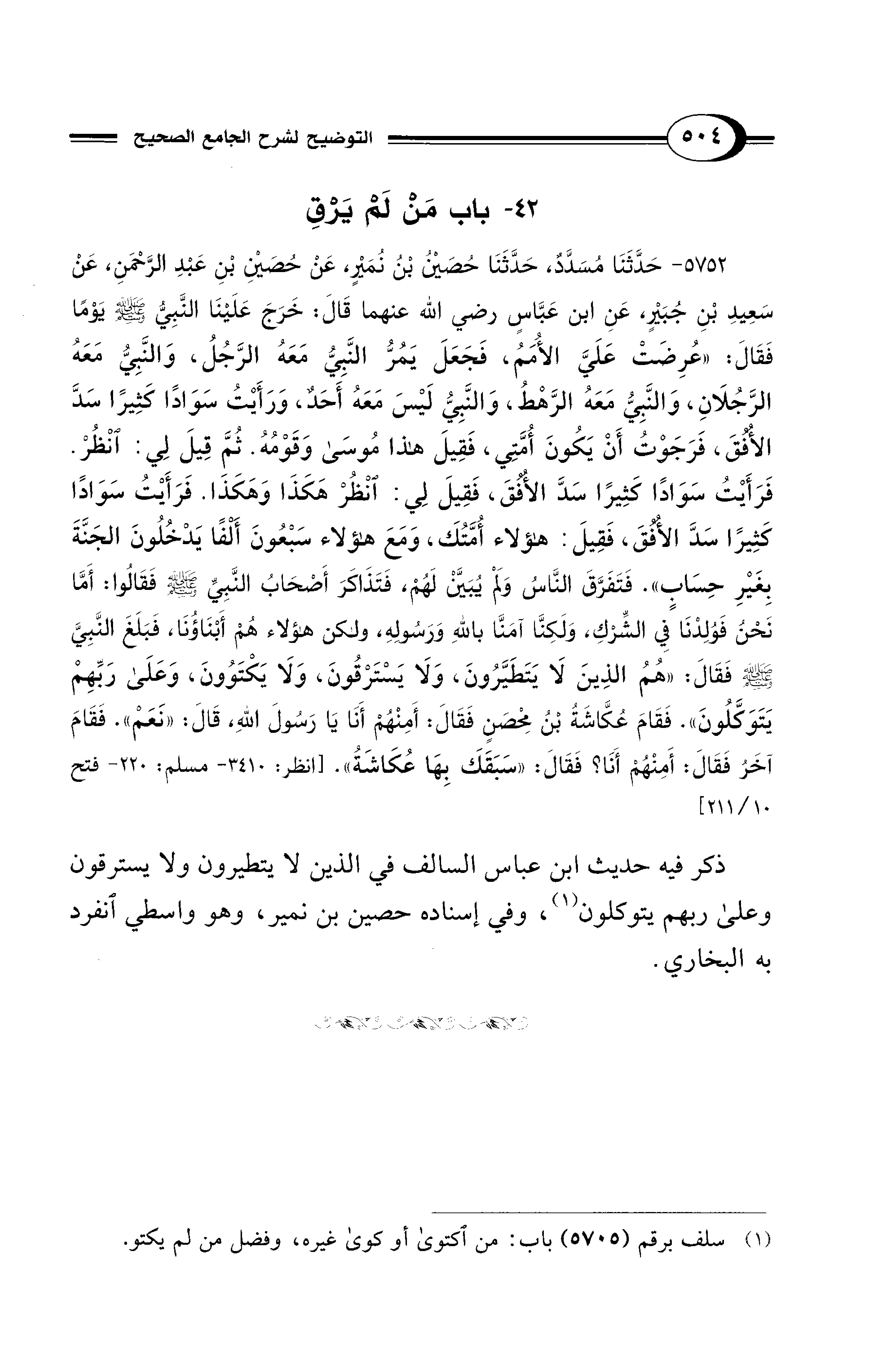 5752 - حَدَّثَنَا مُسَدَّدٌ، حَدَّثَنَا حُصَيْنُ بْنُ نُمَيْرٍ، عَنْ حُصَيْنِ بْنِ عَبْدِ الرَّحْمَنِ، عَنْ سَعِيدِ بْنِ جُبَيْرٍ، عَنِ ابْنِ عَبَّاسٍ - رضي الله عنهما -قَالَ: خَرَجَ عَلَيْنَا النَّبِيُّ - صلى الله عليه وسلم - يَوْمًا فَقَالَ: «عُرِضَتْ عَلَيَّ الأُمَمُ، فَجَعَلَ يَمُرُّ النَّبِيُّ مَعَهُ الرَّجُلُ، وَالنَّبِيُّ مَعَهُ الرَّجُلاَنِ، وَالنَّبِيُّ مَعَهُ الرَّهْطُ، وَالنَّبِيُّ لَيْسَ مَعَهُ أَحَدٌ، وَرَأَيْتُ سَوَادًا كَثِيرًا سَدَّ الأُفُقَ، فَرَجَوْتُ أَنْ يَكُونَ أُمَّتِي، فَقِيلَ هَذَا مُوسَى وَقَوْمُهُ. ثُمَّ قِيلَ لِي: انْظُرْ. فَرَأَيْتُ سَوَادًا كَثِيرًا سَدَّ الأُفُقَ، فَقِيلَ لِي: انْظُرْ هَكَذَا وَهَكَذَا. فَرَأَيْتُ سَوَادًا كَثِيرًا سَدَّ الأُفُقَ، فَقِيلَ: هَؤُلاَءِ أُمَّتُكَ، وَمَعَ هَؤُلاَءِ سَبْعُونَ أَلْفًا يَدْخُلُونَ الْجَنَّةَ بِغَيْرِ حِسَابٍ». فَتَفَرَّقَ النَّاسُ وَلَمْ يُبَيَّنْ لَهُمْ، فَتَذَاكَرَ أَصْحَابُ النَّبِيِّ - صلى الله عليه وسلم - فَقَالُوا: أَمَّا نَحْنُ فَوُلِدْنَا فِي الشِّرْكِ، وَلَكِنَّا آمَنَّا بِاللهِ وَرَسُولِهِ، وَلَكِنْ هَؤُلاَءِ هُمْ أَبْنَاؤُنَا، فَبَلَغَ النَّبِيَّ - صلى الله عليه وسلم - فَقَالَ: «هُمُ الَّذِينَ لاَ يَتَطَيَّرُونَ، وَلاَ يَسْتَرْقُونَ، وَلاَ يَكْتَوُونَ، وَعَلَى رَبِّهِمْ يَتَوَكَّلُونَ». فَقَامَ عُكَّاشَةُ بْنُ مِحْصَنٍ فَقَالَ: أَمِنْهُمْ أَنَا يَا رَسُولَ اللهِ، قَالَ: «نَعَمْ». فَقَامَ آخَرُ فَقَالَ: أَمِنْهُمْ أَنَا؟ فَقَالَ: «سَبَقَكَ بِهَا عُكَّاشَةُ». [انظر: 3410 - مسلم: 220 - فتح 10/ 211]