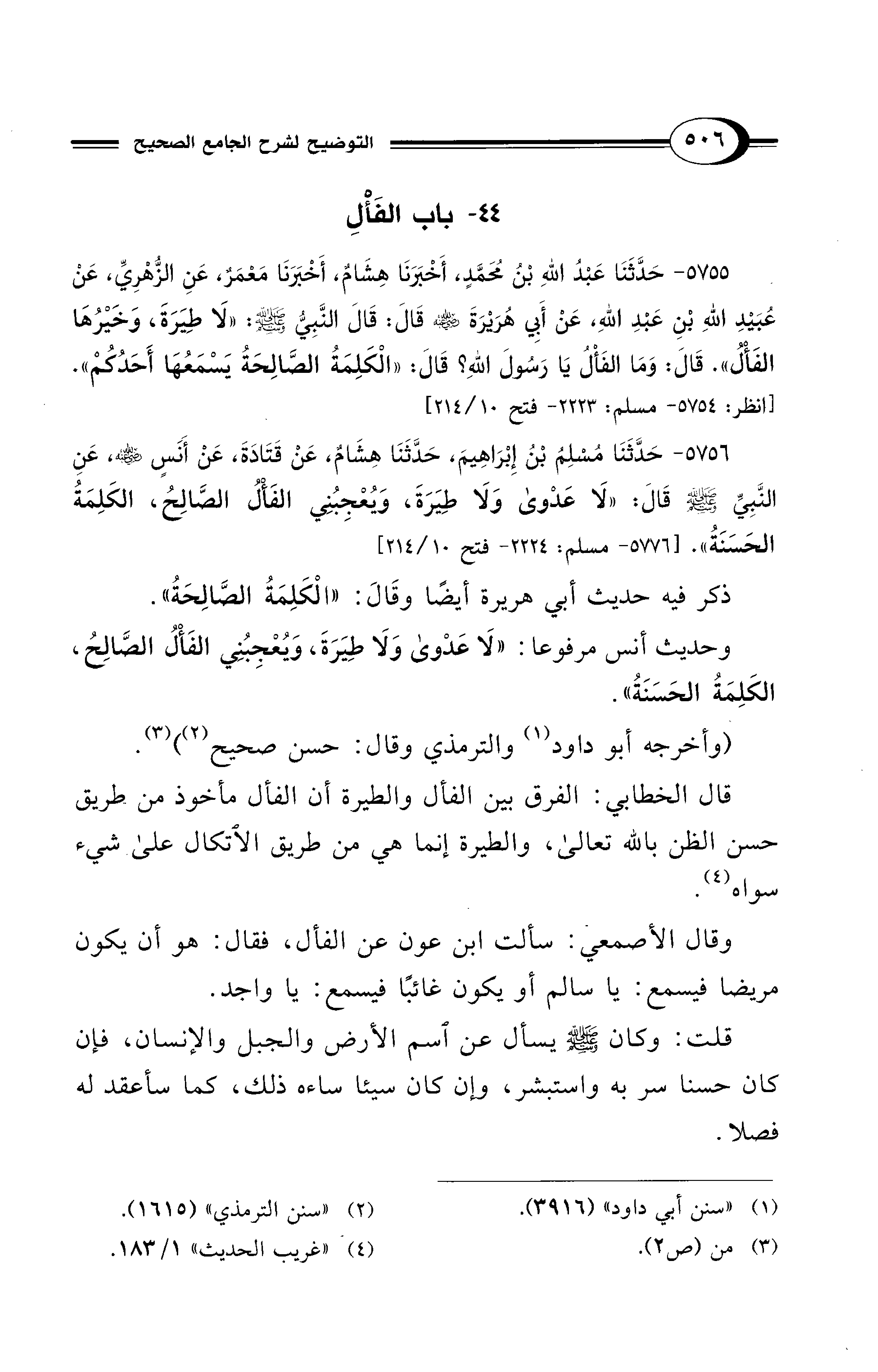 5755 - حَدَّثَنَا عَبْدُ اللهِ بْنُ مُحَمَّدٍ، أَخْبَرَنَا هِشَامٌ، أَخْبَرَنَا مَعْمَرٌ، عَنِ الزُّهْرِيِّ، عَنْ عُبَيْدِ اللهِ بْنِ عَبْدِ اللهِ، عَنْ أَبِي هُرَيْرَةَ - رضي الله عنه - قَالَ: قَالَ النَّبِيُّ - صلى الله عليه وسلم - «لاَ طِيَرَةَ، وَخَيْرُهَا الْفَأْلُ». قَالَ: وَمَا الْفَأْلُ يَا رَسُولَ اللهِ؟ قَالَ: «الْكَلِمَةُ الصَّالِحَةُ يَسْمَعُهَا أَحَدُكُمْ». [انظر: 5754 - مسلم: 2223 - فتح 10/ 214]