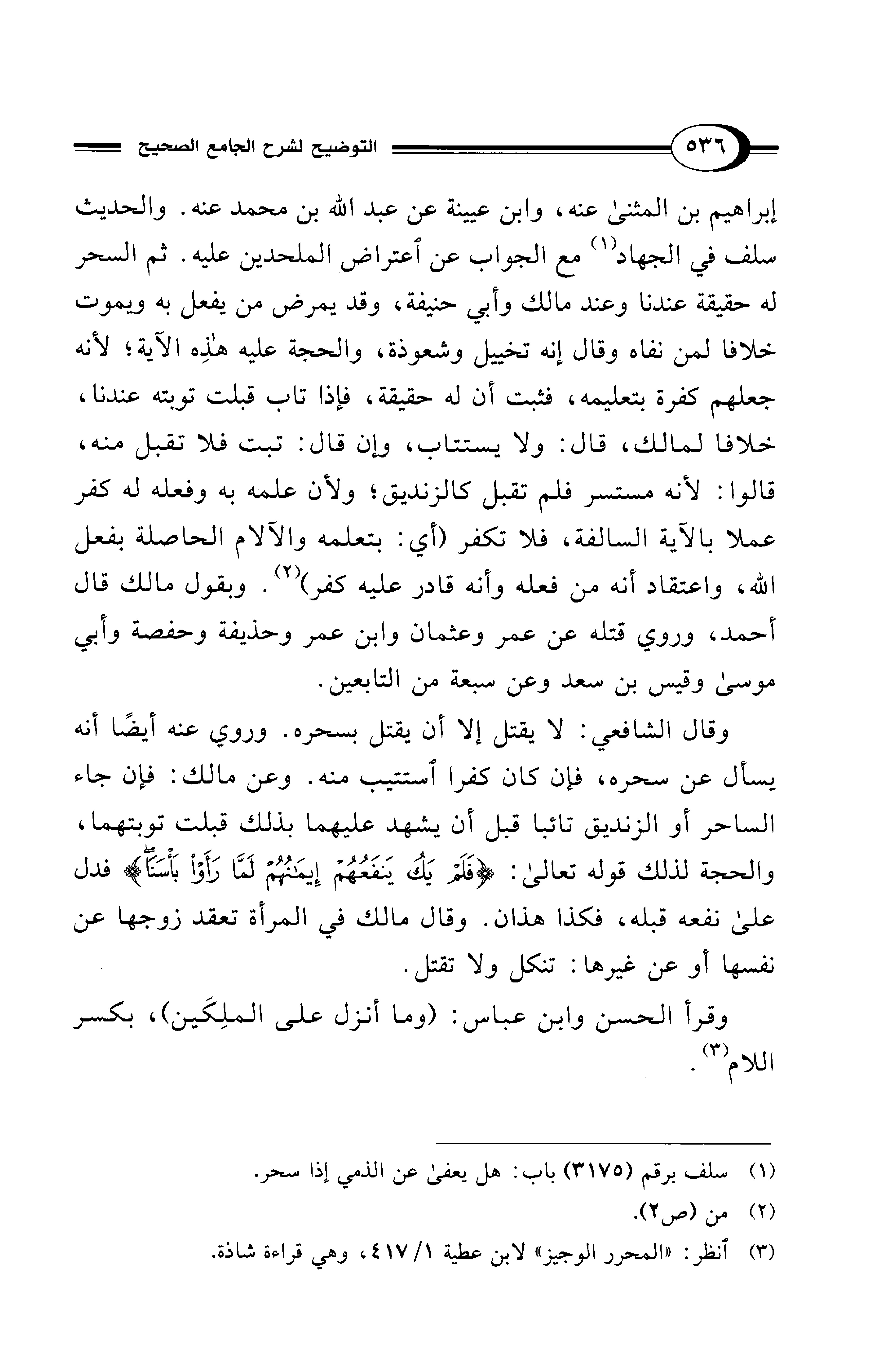إبراهيم بن المثنى عنه، وابن عيينة عن عبد الله بن محمد عنه. والحديث سلف في الجهاد (¬1) مع الجواب عن اعتراض الملحدين عليه. ثم السحر له حقيقة عندنا وعند مالك وأبي حنيفة، وقد يمرض من يفعل به ويموت خلافا لمن نفاه وقال إنه تخييل وشعوذة، والحجة عليه هذِه الآية؛ لأنه جعلهم كفرة بتعليمه، فثبت أن له حقيقة، فإذا تاب قبلت توبته عندنا، خلافا لمالك، قال: ولا يستتاب، وإن قال: تبت فلا تقبل منه، قالوا: لأنه مستسر فلم تقبل كالزنديق؛ ولأن علمه به وفعله له كفر عملا بالآية السالفة، فلا تكفر (أي: بتعلمه والآلام الحاصلة بفعل الله، واعتقاد أنه من فعله وأنه قادر عليه كفر) (¬2). وبقول مالك قال أحمد، وروي قتله عن عمر وعثمان وابن عمر وحذيفة وحفصة وأبي موسى وقيس بن سعد وعن سبعة من التابعين.