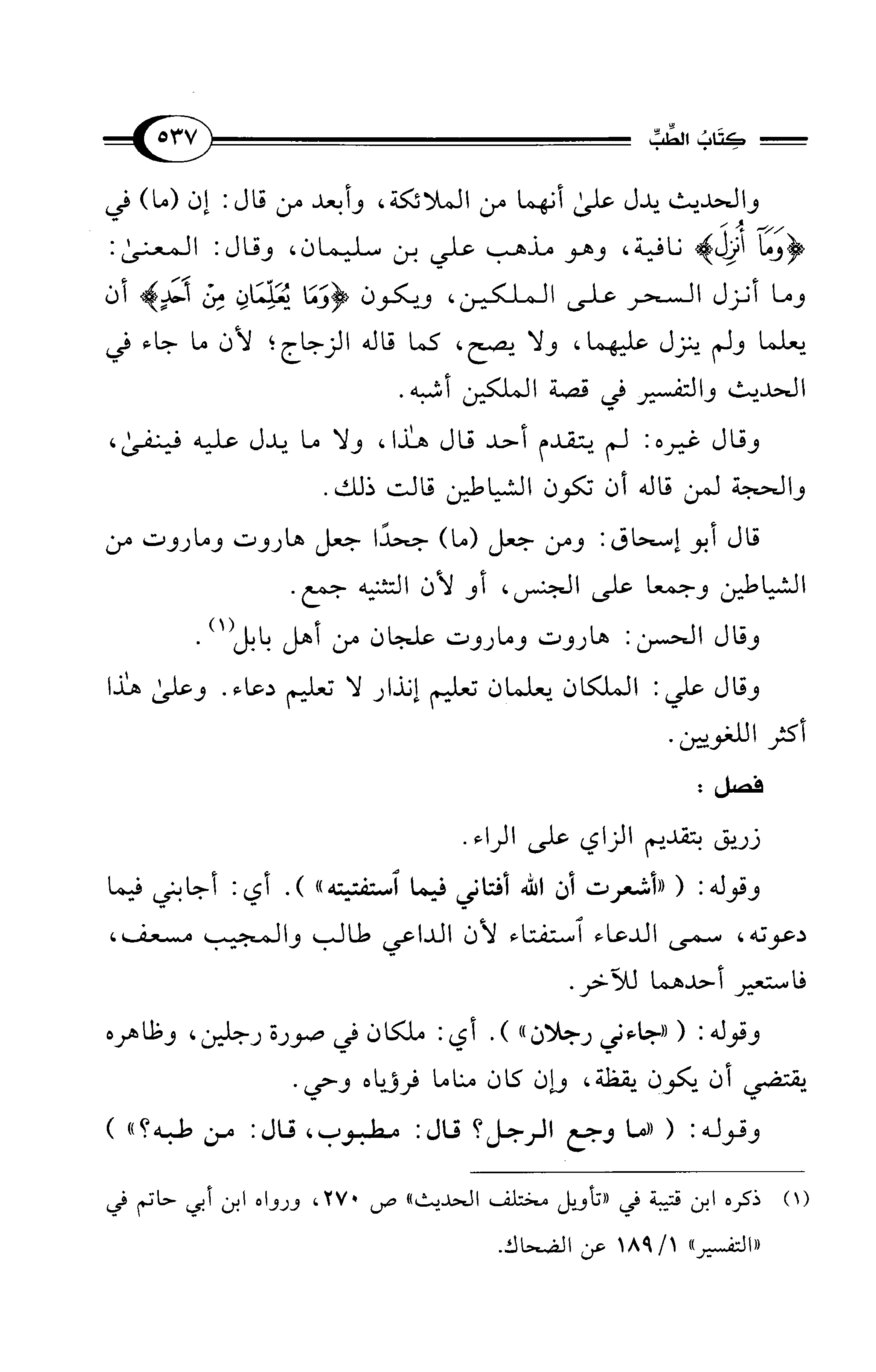 والحديث يدل على أنهما من الملائكة، وأبعد من قال: إن (ما) في {وَمَا أُنْزِلَ} نافية، وهو مذهب علي بن سليمان، وقال: المعنى: وما أنزل السحر على الملكين، ويكون {وَمَا يُعَلِّمَانِ مِنْ أَحَدٍ} أن يعلما ولم ينزل عليهما، ولا يصح، كما قاله الزجاج؛ لأن ما جاء في الحديث والتفسير في قصة الملكين أشبه.