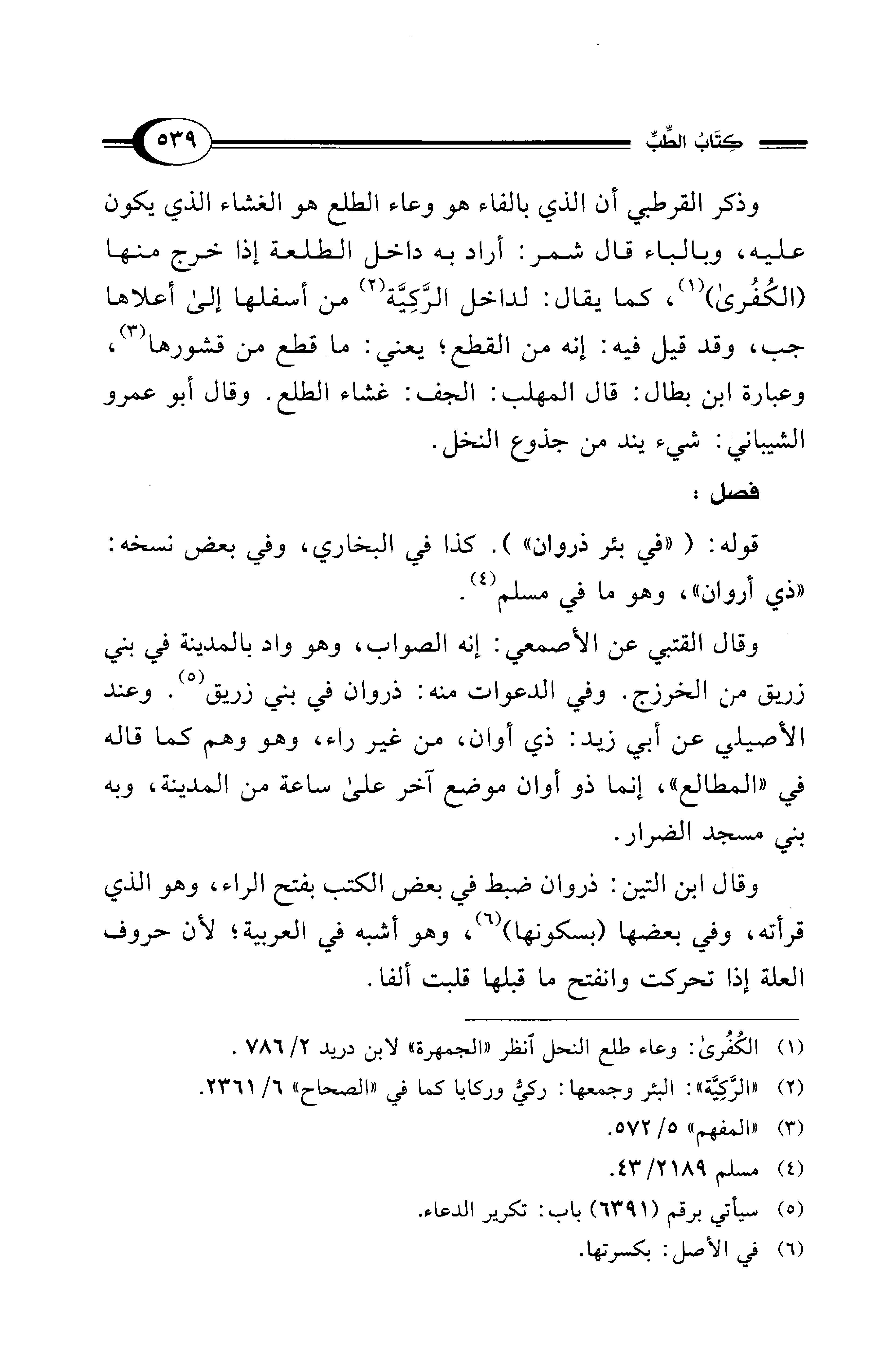 وذكر القرطبي أن الذي بالفاء هو وعاء الطلع هو الغشاء الذي يكون عليه، وبالباء قال شمر: أراد به داخل الطلعة إذا خرج منها (الكُفُرى) (¬1)، كما يقال: لداخل الرَّكِيَّة (¬2) من أسفلها إلى أعلاها جب، وقد قيل فيه: إنه من القطع؛ يعني: ما قطع من قشورها (¬3)، وعبارة ابن بطال: قال المهلب: الجف: غشاء الطلع. وقال أبو عمرو الشيباني: شيء يند من جذوع النخل.