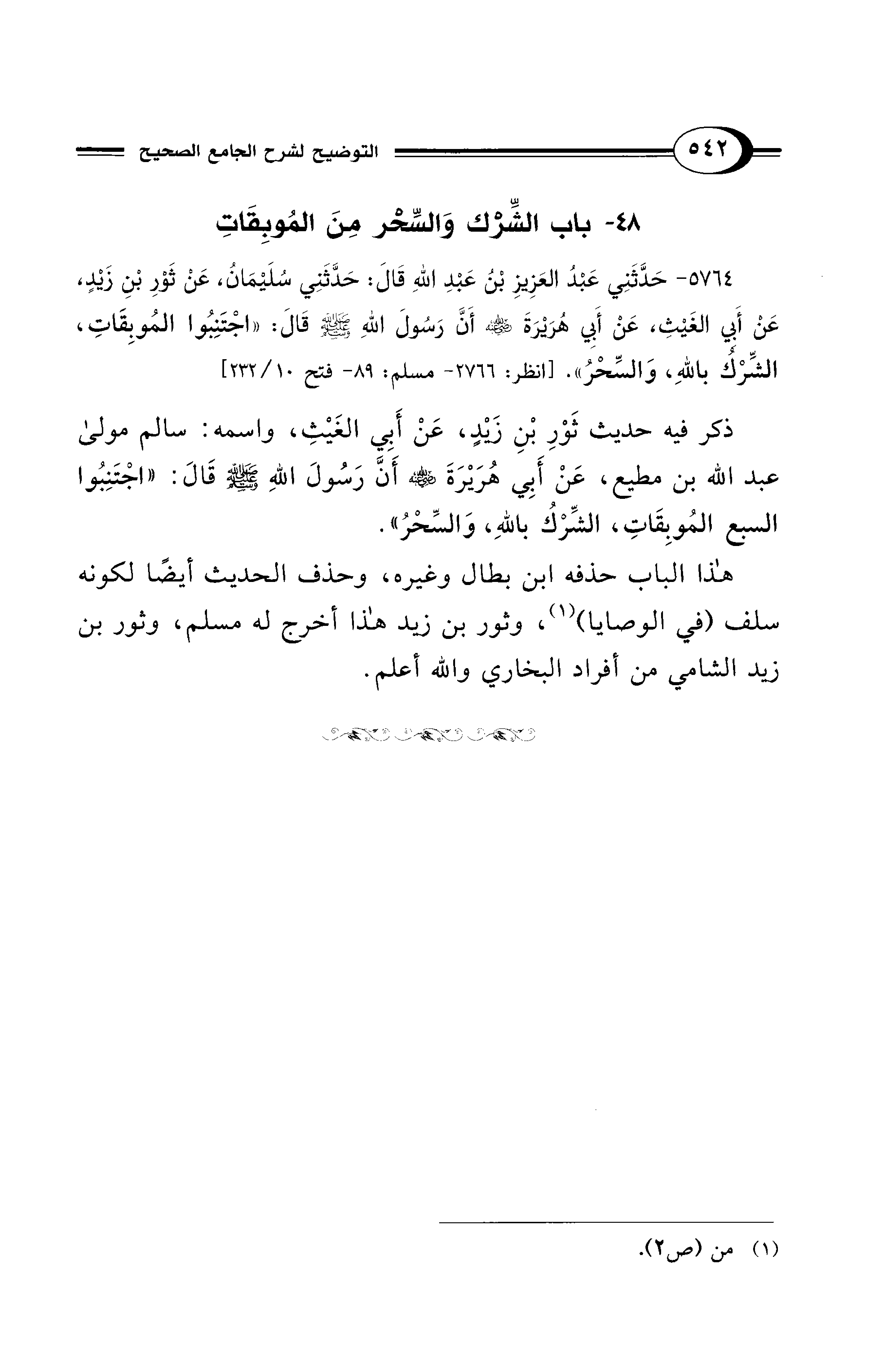 ذكر فيه حديث ثَوْرِ بْنِ زيدٍ، عَنْ أَبِي الغَيْثِ، واسمه: سالم مولى عبد الله بن مطيع، عَنْ أَبِي هُرَيْرَةَ - رضي الله عنه - أَنَّ رَسُولَ اللهِ - صلى الله عليه وسلم - قَالَ: "اجْتَنِبُوا السبع المُوبِقَاتِ، الشِّرْكُ باللهِ، وَالسِّحْرُ".