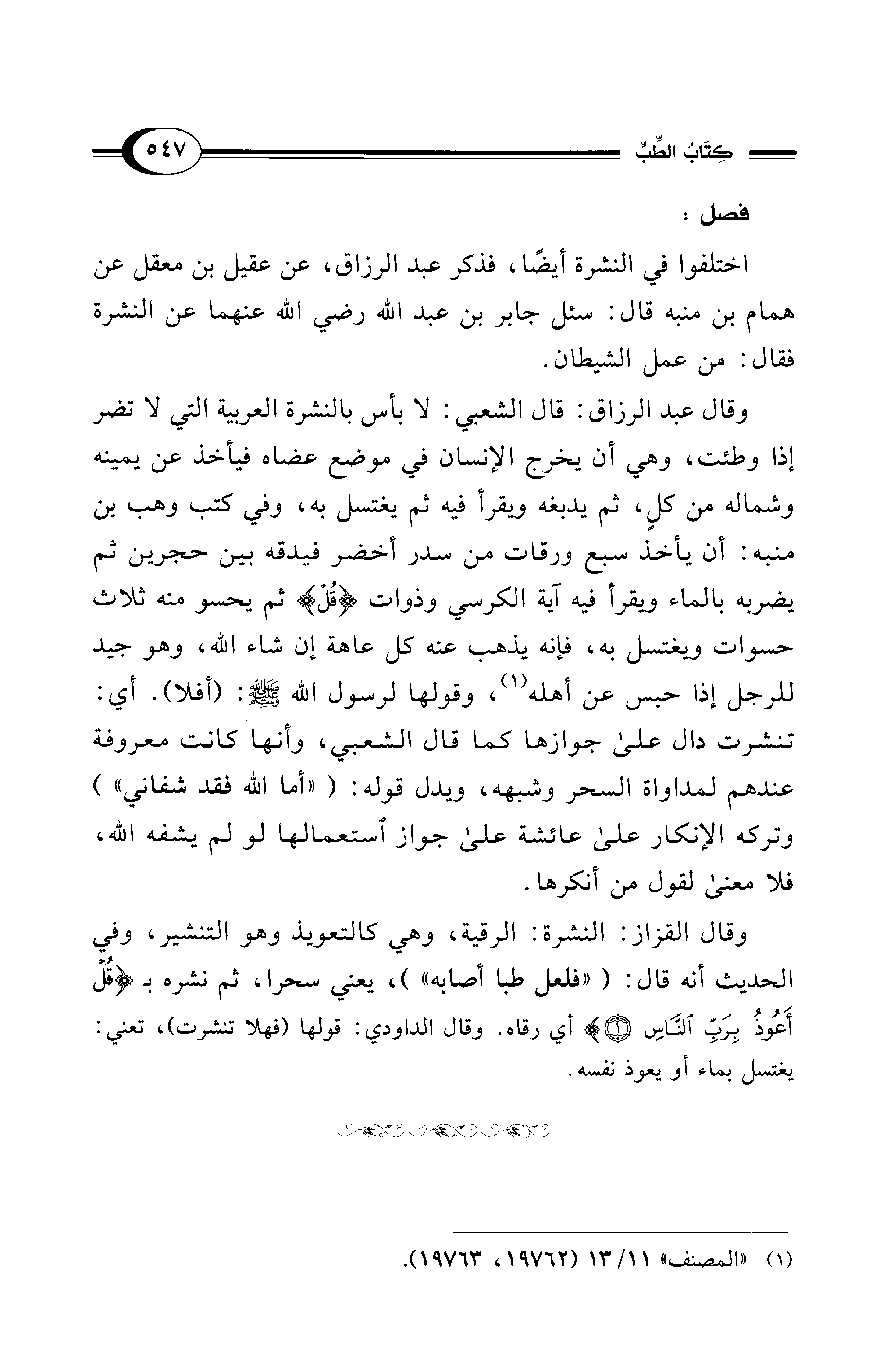 اختلفوا في النشرة أيضًا، فذكر عبد الرزاق، عن عقيل بن معقل عن همام بن منبه قال: سئل جابر بن عبد الله - رضي الله عنهما - عن النشرة فقال: من عمل الشيطان.