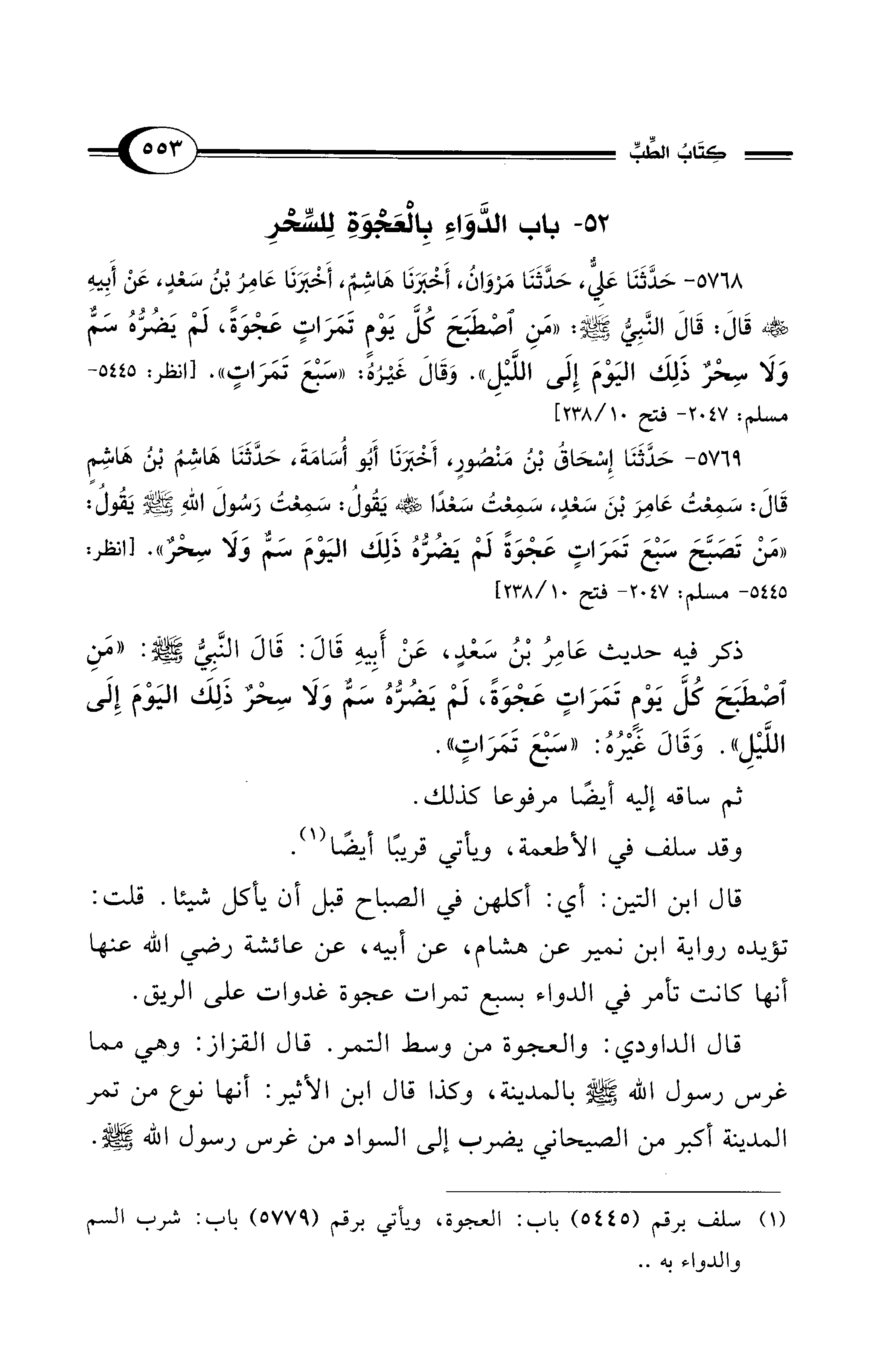 (¬1) سلف برقم (5445) باب: العجوة، ويأتي برقم (5779) باب: شرب السم والدواء به ..