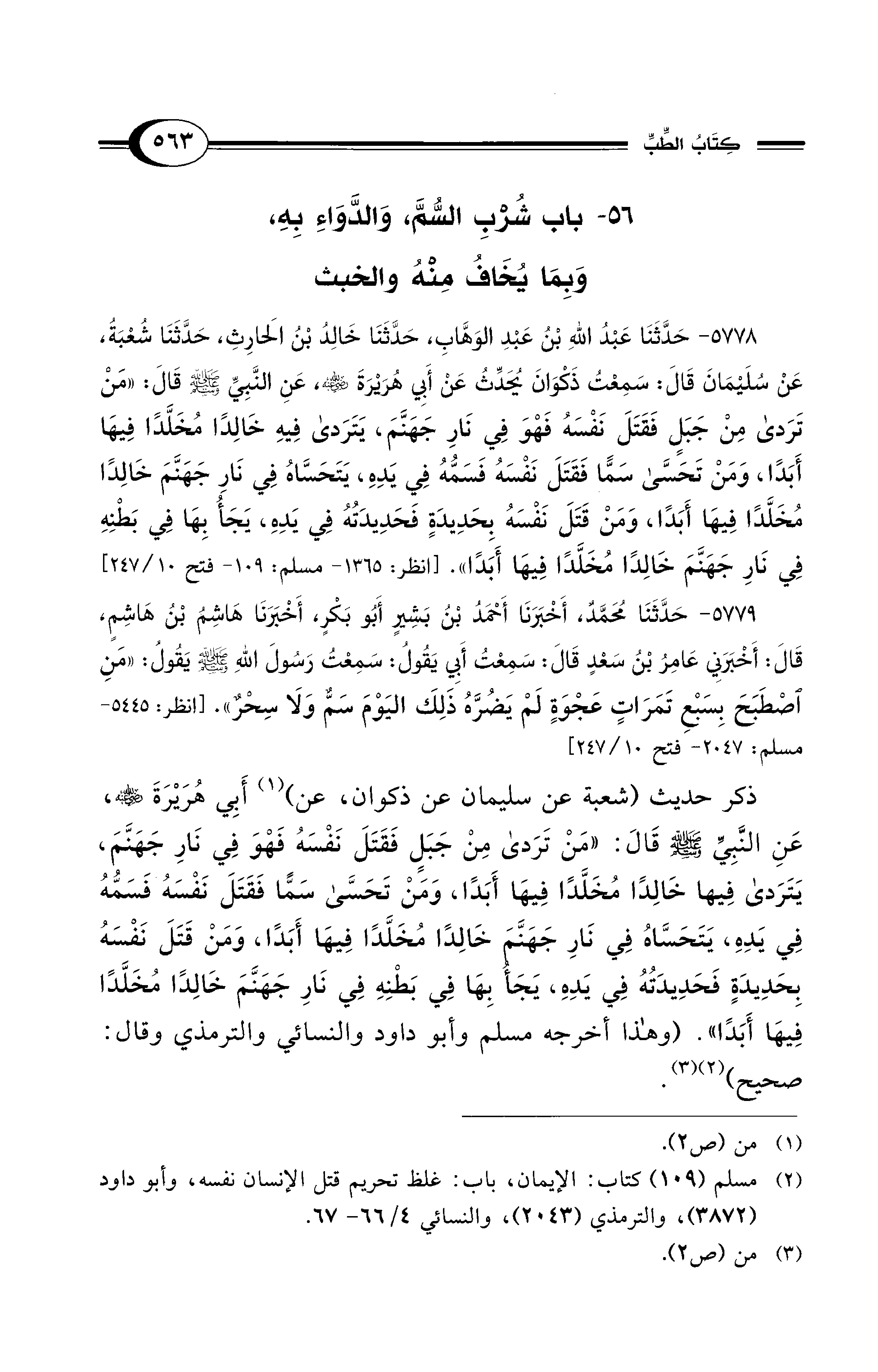 5778 - حَدَّثَنَا عَبْدُ اللهِ بْنُ عَبْدِ الْوَهَّابِ، حَدَّثَنَا خَالِدُ بْنُ الحَارِثِ، حَدَّثَنَا شُعْبَةُ، عَنْ سُلَيْمَانَ قَالَ: سَمِعْتُ ذَكْوَانَ يُحَدِّثُ عَنْ أَبِي هُرَيْرَةَ - رضي الله عنه -، عَنِ النَّبِيِّ - صلى الله عليه وسلم - قَالَ: «مَنْ تَرَدَّى مِنْ جَبَلٍ فَقَتَلَ نَفْسَهُ فَهْوَ فِي نَارِ جَهَنَّمَ، يَتَرَدَّى فِيهِ خَالِدًا مُخَلَّدًا فِيهَا أَبَدًا، وَمَنْ تَحَسَّى سَمًّا فَقَتَلَ نَفْسَهُ فَسَمُّهُ فِي يَدِهِ، يَتَحَسَّاهُ فِي نَارِ جَهَنَّمَ خَالِدًا مُخَلَّدًا فِيهَا أَبَدًا، وَمَنْ قَتَلَ نَفْسَهُ بِحَدِيدَةٍ فَحَدِيدَتُهُ فِي يَدِهِ، يَجَأُ بِهَا فِي بَطْنِهِ فِي نَارِ جَهَنَّمَ خَالِدًا مُخَلَّدًا فِيهَا أَبَدًا». [انظر: 1365 - مسلم: 109 - فتح 10/ 247]