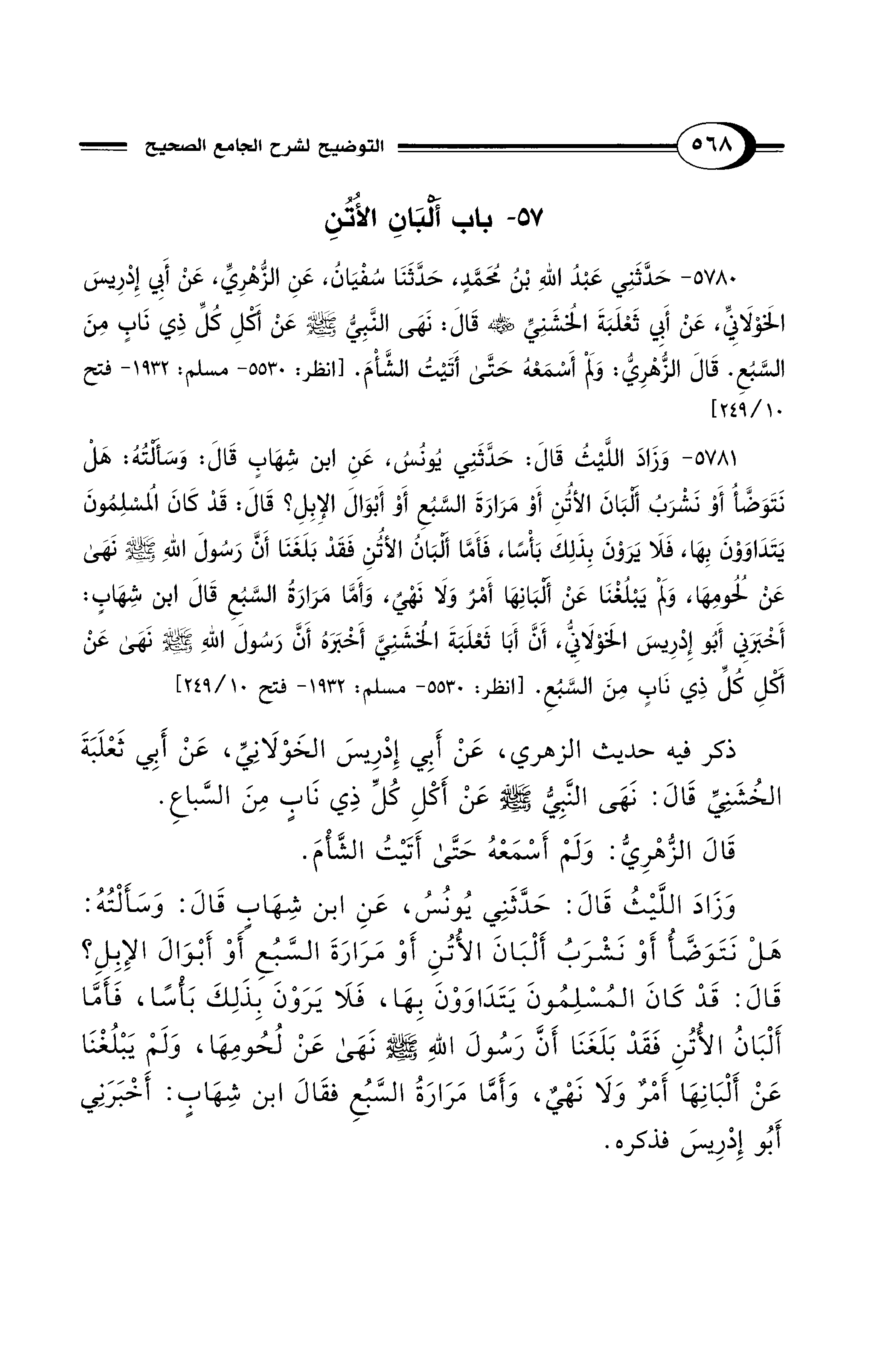 5780 - حَدَّثَنِي عَبْدُ اللهِ بْنُ مُحَمَّدٍ، حَدَّثَنَا سُفْيَانُ، عَنِ الزُّهْرِيِّ، عَنْ أَبِي إِدْرِيسَ الْخَوْلاَنِيِّ، عَنْ أَبِي ثَعْلَبَةَ الْخُشَنِيِّ - رضي الله عنه - قَالَ: نَهَى النَّبِيُّ - صلى الله عليه وسلم - عَنْ أَكْلِ كُلِّ ذِي نَابٍ مِنَ السَّبُعِ. قَالَ الزُّهْرِيُّ: وَلَمْ أَسْمَعْهُ حَتَّى أَتَيْتُ الشَّأْمَ. [انظر: 5530 - مسلم: 1932 - فتح