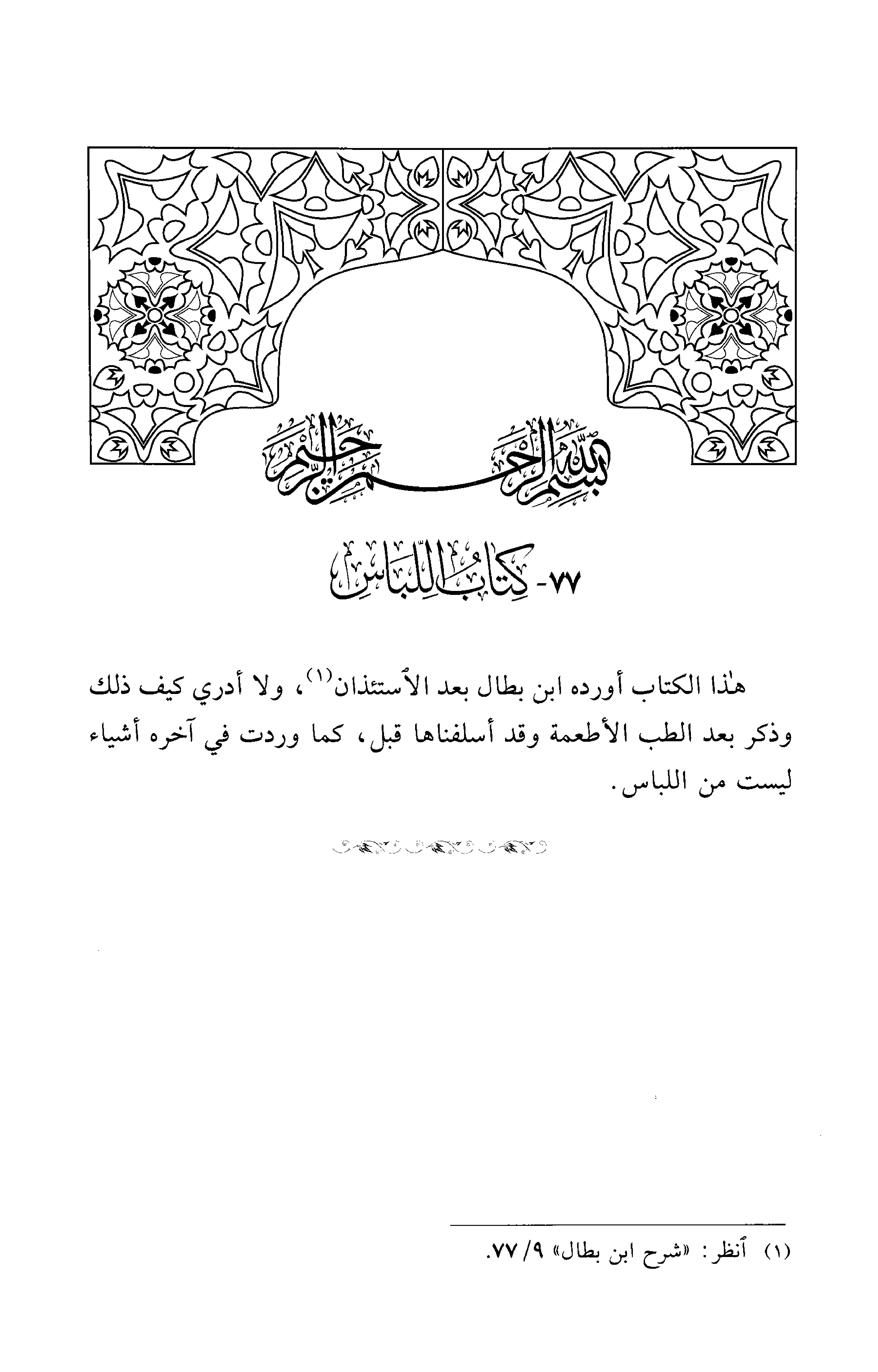 هذا الكتاب أورده ابن بطال بعد الاستئذان (¬1)، ولا أدري كيف ذلك وذكر بعد الطب الأطعمة وقد أسلفناها قبل، كما وردت في آخره أشياء ليست من اللباس.