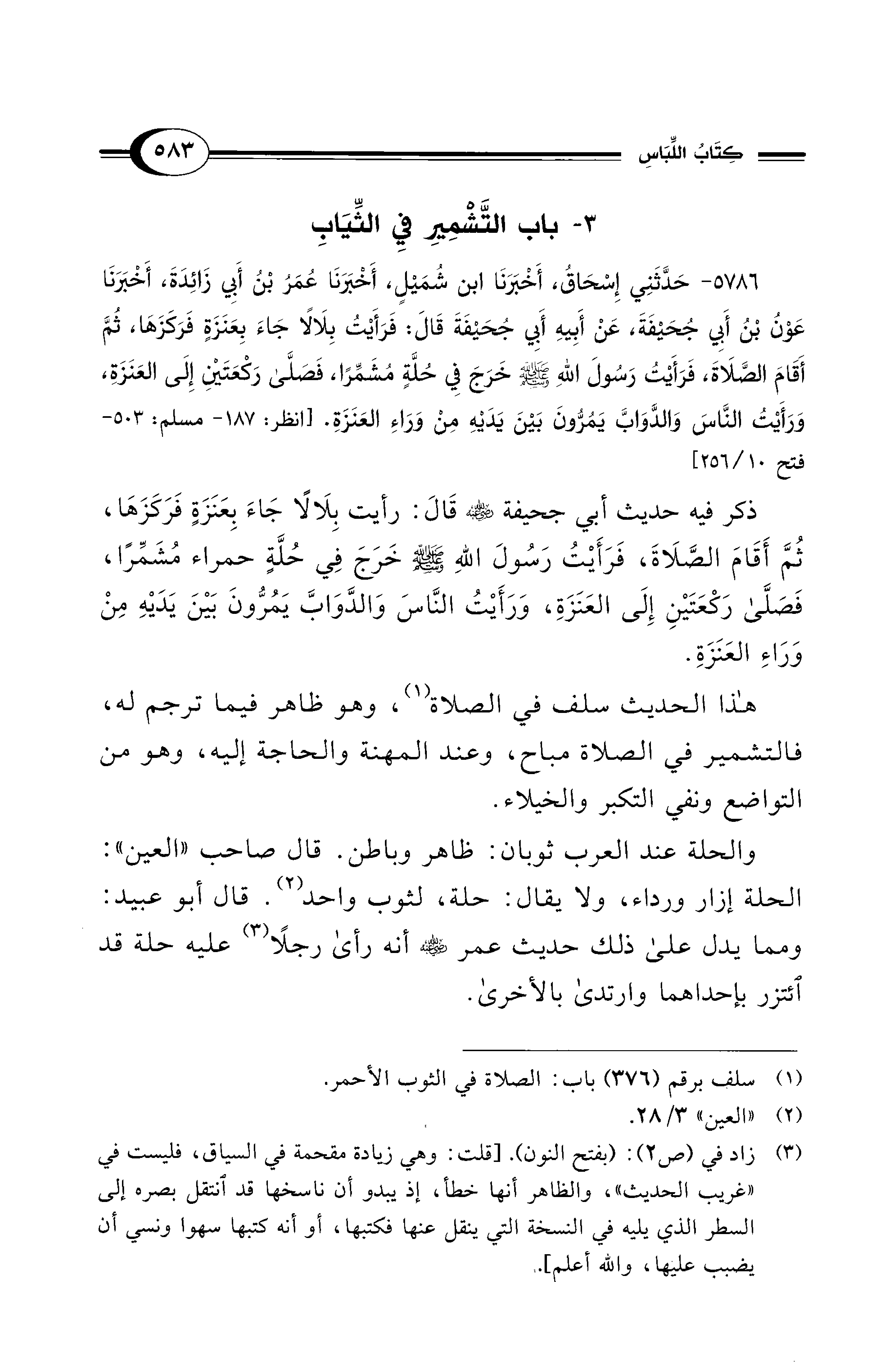 5786 - حَدَّثَنِي إِسْحَاقُ، أَخْبَرَنَا ابْنُ شُمَيْلٍ، أَخْبَرَنَا عُمَرُ بْنُ أَبِي زَائِدَةَ، أَخْبَرَنَا عَوْنُ بْنُ أَبِي جُحَيْفَةَ، عَنْ أَبِيهِ أَبِي جُحَيْفَةَ قَالَ: فَرَأَيْتُ بِلاَلاً جَاءَ بِعَنَزَةٍ فَرَكَزَهَا، ثُمَّ أَقَامَ الصَّلاَةَ، فَرَأَيْتُ رَسُولَ اللهِ - صلى الله عليه وسلم - خَرَجَ فِي حُلَّةٍ مُشَمِّرًا، فَصَلَّى رَكْعَتَيْنِ إِلَى العَنَزَةِ، وَرَأَيْتُ النَّاسَ وَالدَّوَابَّ يَمُرُّونَ بَيْنَ يَدَيْهِ مِنْ وَرَاءِ العَنَزَةِ. [انظر: 187 - مسلم: 503 - فتح 10/ 256]
