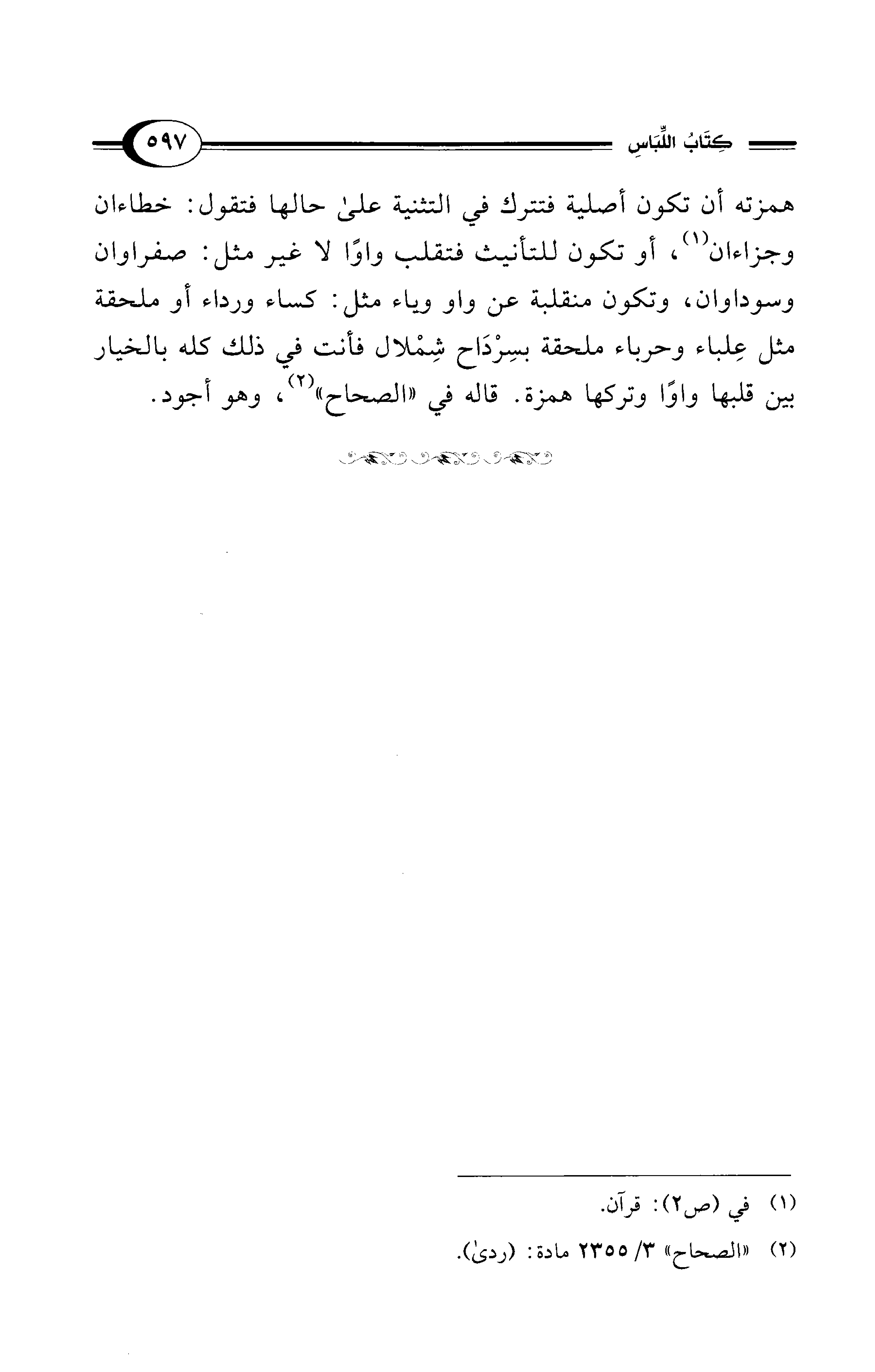 همزته أن تكون أصلية فتترك في التثنية على حالها فتقول: خطاءان وجزاءان (¬1)، أو تكون للتأنيث فتقلب واوًا لا غير مثل: صفراوان وسوداوان، وتكون منقلبة عن واو وياء مثل: كساء ورداء أو ملحقة مثل عِلباء وحرباء ملحقة بسِرْدَاح شِمْلال فأنت في ذلك كله بالخيار بين قلبها واوًا وتركها همزة. قاله في "الصحاح" (¬2)، وهو أجود.