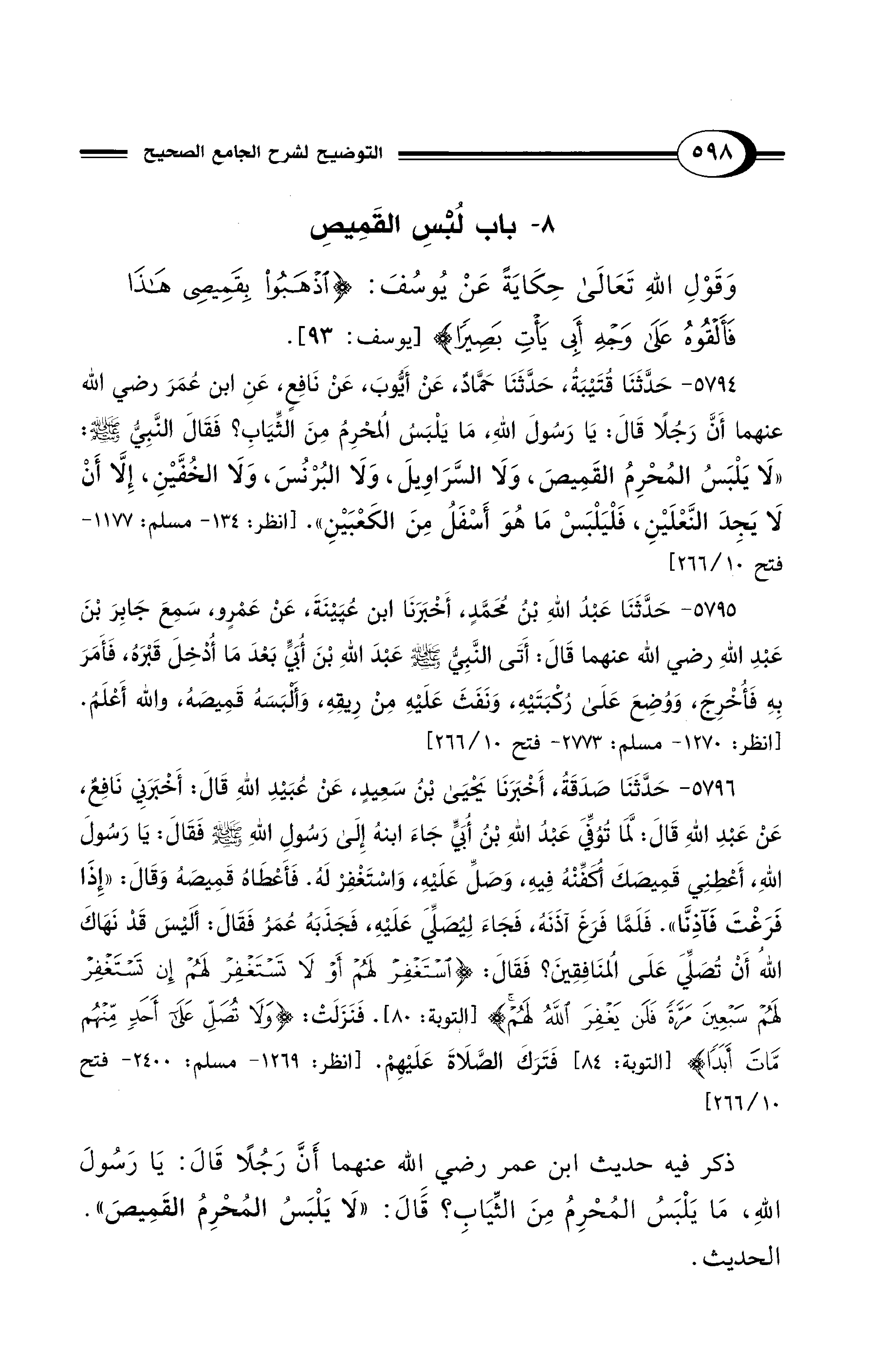 5796 - حَدَّثَنَا صَدَقَةُ، أَخْبَرَنَا يَحْيَى بْنُ سَعِيدٍ، عَنْ عُبَيْدِ اللهِ قَالَ: أَخْبَرَنِي نَافِعٌ، عَنْ عَبْدِ اللهِ قَالَ: لَمَّا تُوُفِّيَ عَبْدُ اللهِ بْنُ أُبَيٍّ جَاءَ ابْنُهُ إِلَى رَسُولِ اللهِ - صلى الله عليه وسلم - فَقَالَ: يَا رَسُولَ اللهِ، أَعْطِنِي قَمِيصَكَ أُكَفِّنْهُ فِيهِ، وَصَلِّ عَلَيْهِ، وَاسْتَغْفِرْ لَهُ. فَأَعْطَاهُ قَمِيصَهُ، وَقَالَ: «إِذَا فَرَغْتَ فَآذِنَّا». فَلَمَّا فَرَغَ آذَنَهُ، فَجَاءَ لِيُصَلِّيَ عَلَيْهِ، فَجَذَبَهُ عُمَرُ فَقَالَ: أَلَيْسَ قَدْ نَهَاكَ اللهُ أَنْ تُصَلِّيَ عَلَى الْمُنَافِقِينَ؟ فَقَالَ: {اسْتَغْفِرْ لَهُمْ أَوْ لاَ تَسْتَغْفِرْ لَهُمْ إِنْ تَسْتَغْفِرْ لَهُمْ سَبْعِينَ مَرَّةً فَلَنْ يَغْفِرَ اللهُ لَهُمْ} [التوبة: 80]. فَنَزَلَتْ: {وَلاَ تُصَلِّ على أَحَدٍ مِنْهُمْ مَاتَ أَبَدًا} [التوبة: 84] فَتَرَكَ الصَّلاَةَ عَلَيْهِمْ. [انظر: 1269 - مسلم: 2400 - فتح 10/ 266]