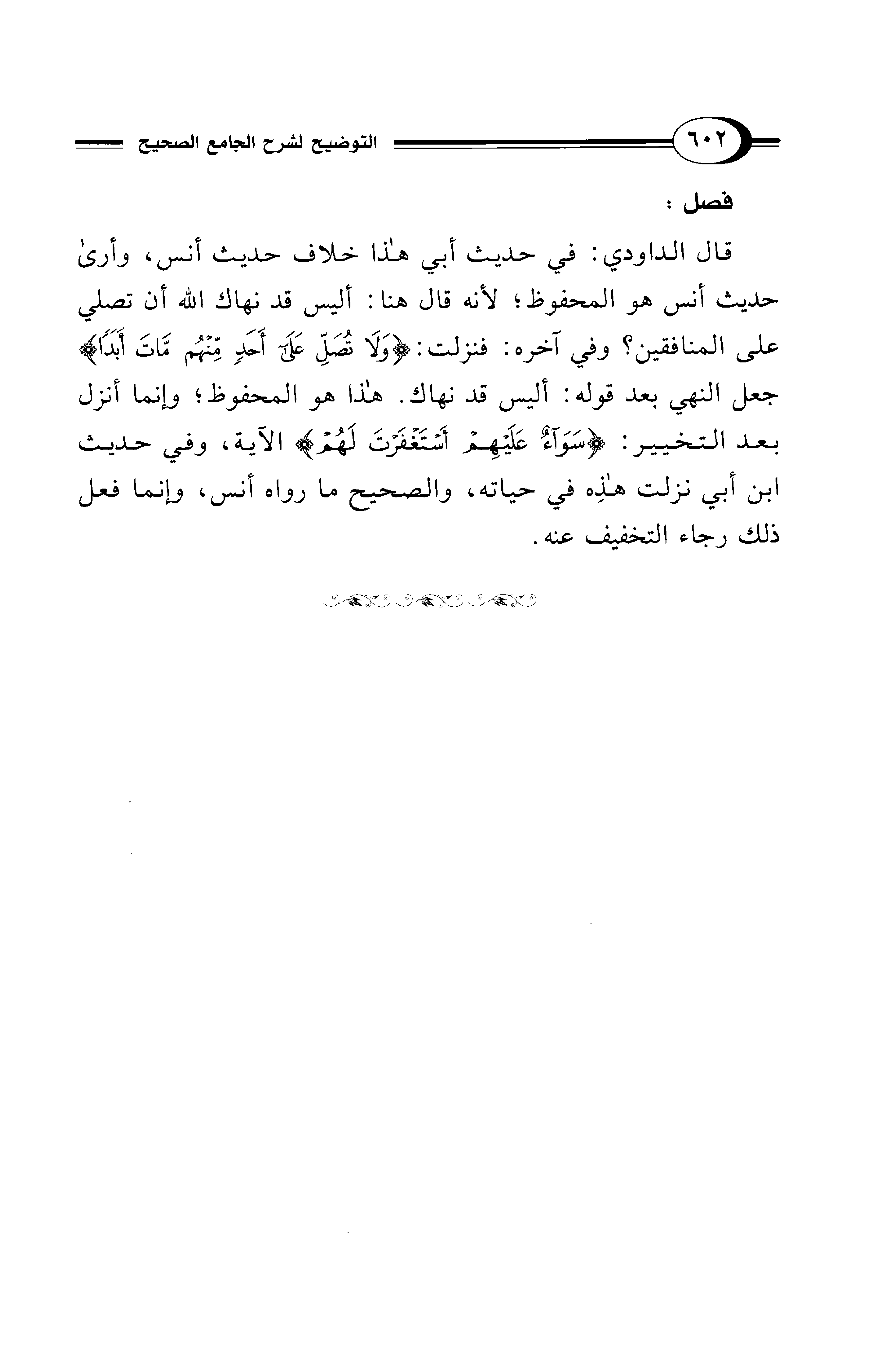 قال الداودي: في حديث أبي هذا خلاف حديث أنس، وأرى حديث أنس هو المحفوظ؛ لأنه قال هنا: أليس قد نهاك الله أن تصلي على المنافقين؟ وفي آخره: فنزلت: {وَلَا تُصَلِّ عَلَى أَحَدٍ مِنْهُمْ مَاتَ أَبَدًا} جعل النهي بعد قوله: أليس قد نهاك. هذا هو المحفوظ؛ وإنما أنزل بعد التخيير: {سَوَاءٌ عَلَيْهِمْ أَسْتَغْفَرْتَ لَهُمْ} الآية، وفي حديث ابن أبي نزلت هذِه في حياته، والصحيح ما رواه أنس، وإنما فعل ذلك رجاء التخفيف عنه.