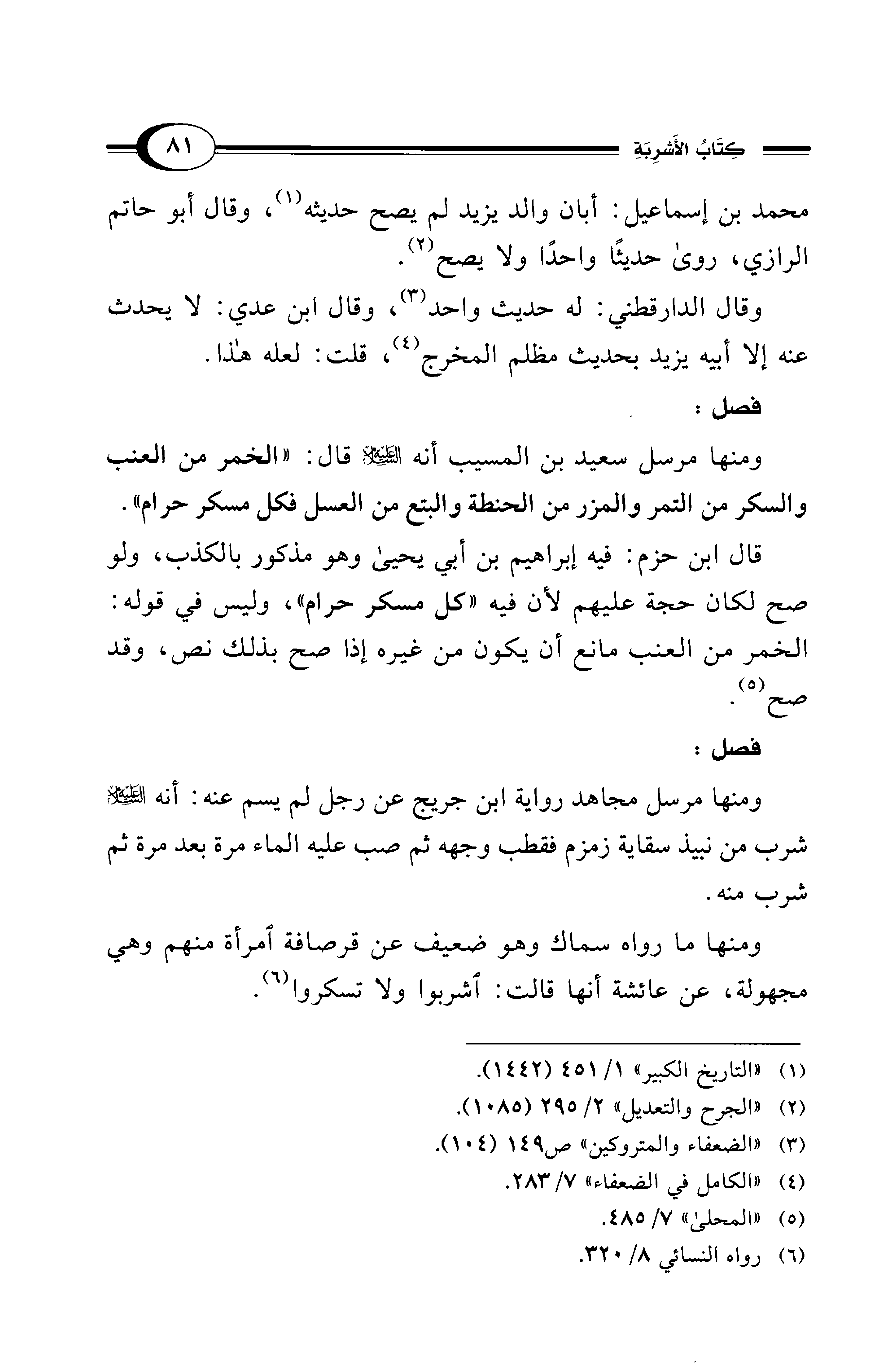 قال ابن حزم: فيه إبراهيم بن أبي يحيى وهو مذكور بالكذب، ولو صح لكان حجة عليهم لأن فيه "كل مسكر حرام"، وليس في قوله: الخمر من العنب مانع أن يكون من غيره إذا صح بذلك نص، وقد صح (¬5).