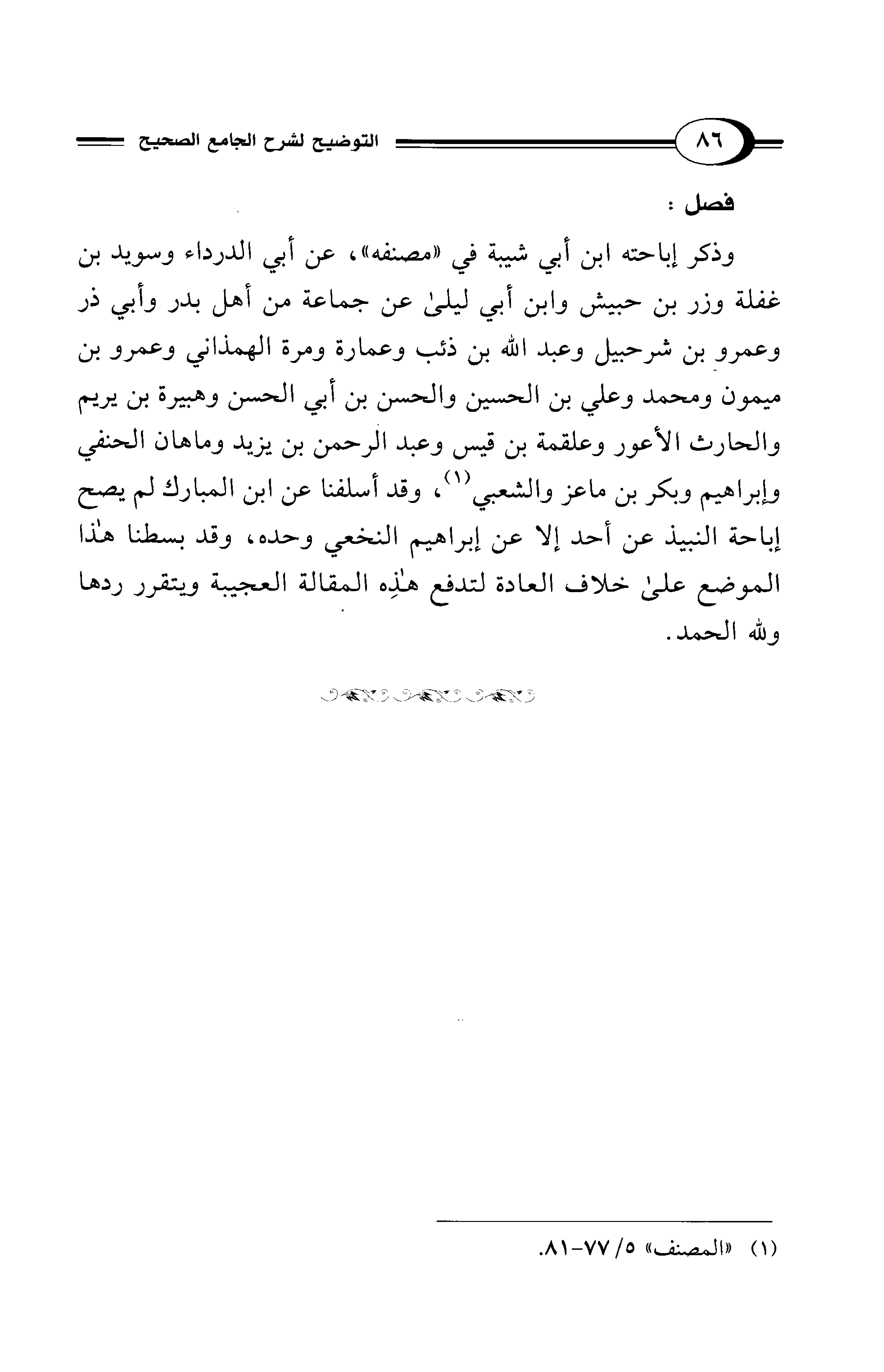 وذكر إباحته ابن أبي شيبة في "مصنفه"، عن أبي الدرداء وسويد بن غفلة وزر بن حبيش وابن أبي ليلى عن جماعة من أهل بدر وأبي ذر وعمرو بن شرحبيل وعبد الله بن ذئب وعمارة ومرة الهمذاني وعمرو بن ميمون ومحمد وعلي بن الحسين والحسن بن أبي الحسن وهبيرة بن يريم والحارث الأعور وعلقمة بن قيس وعبد الرحمن بن يزيد وماهان الحنفي وإبراهيم وبكر بن ماعز والشعبي (¬1)، وقد أسلفنا عن ابن المبارك لم يصح إباحة النبيذ عن أحد إلا عن إبراهيم النخعي وحده، وقد بسطنا هذا الموضع على خلاف العادة لتدفع هذِه المقالة العجيبة ويتقرر ردها ولله الحمد.
