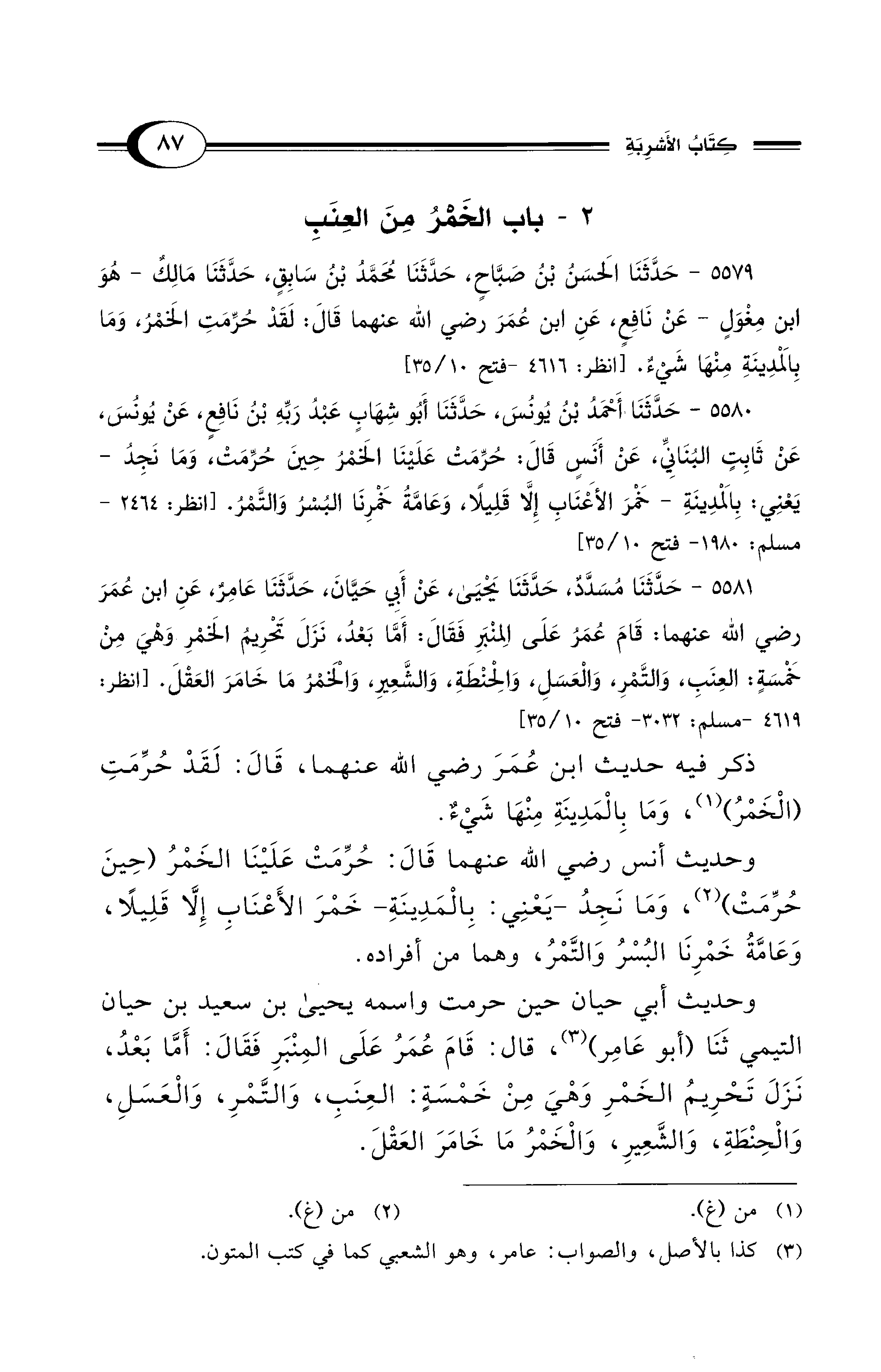 5581 - حَدَّثَنَا مُسَدَّدٌ، حَدَّثَنَا يَحْيَى، عَنْ أَبِي حَيَّانَ، حَدَّثَنَا عَامِرٌ، عَنِ ابْنِ عُمَرَ - رضي الله عنهما -: قَامَ عُمَرُ عَلَى الْمِنْبَرِ فَقَالَ: أَمَّا بَعْدُ، نَزَلَ تَحْرِيمُ الْخَمْرِ وَهْيَ مِنْ خَمْسَةٍ: الْعِنَبِ، وَالتَّمْرِ, وَالْعَسَلِ، وَالْحِنْطَةِ، وَالشَّعِيرِ، وَالْخَمْرُ مَا خَامَرَ الْعَقْلَ. [انظر: 4619 - مسلم: 3032 - فتح 10/ 35]