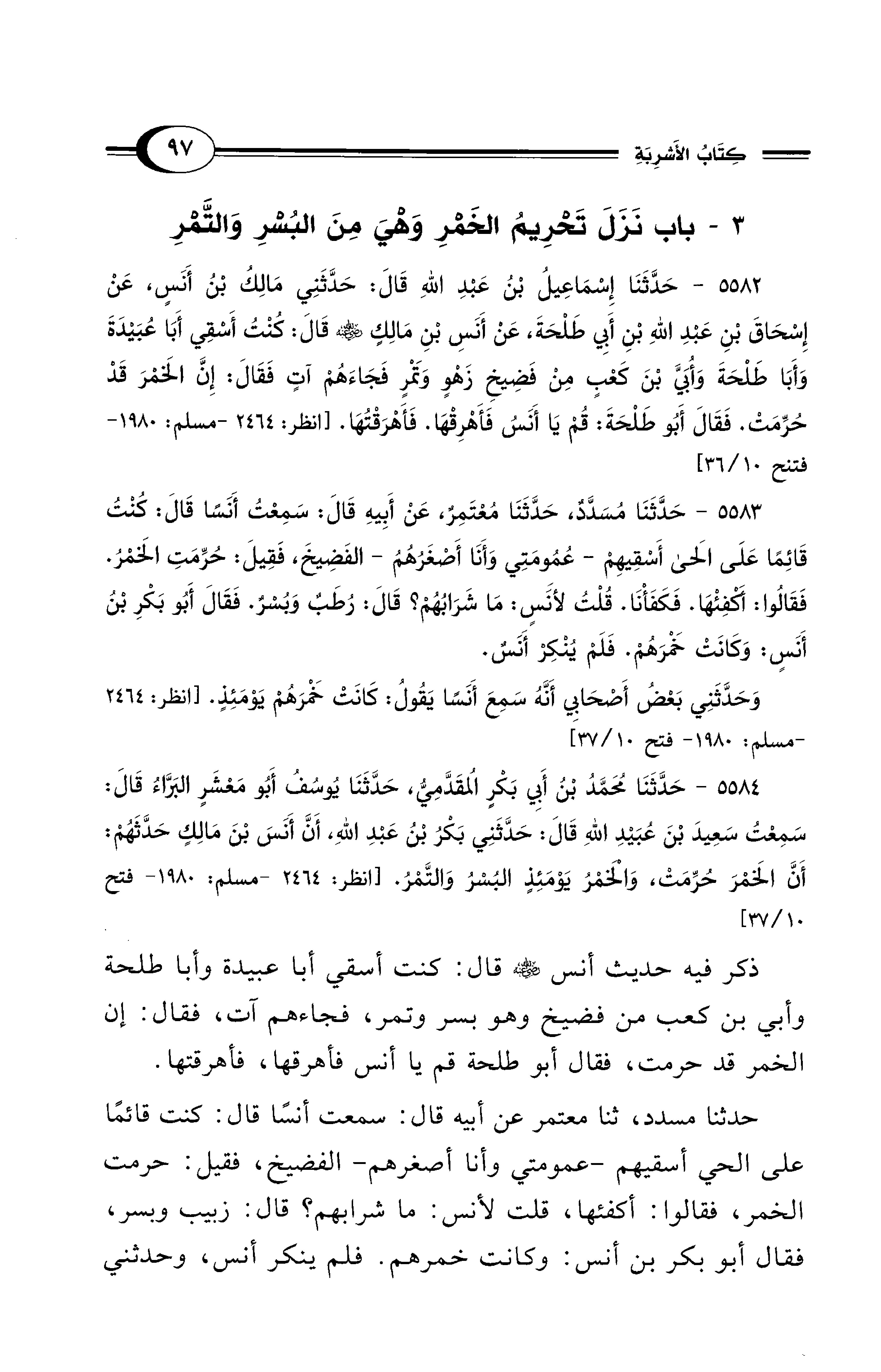 5583 - حَدَّثَنَا مُسَدَّدٌ، حَدَّثَنَا مُعْتَمِرٌ، عَنْ أَبِيهِ قَالَ: سَمِعْتُ أَنَسًا قَالَ: كُنْتُ قَائِمًا على الْحَيِّ أَسْقِيهِمْ -عُمُومَتِي وَأَنَا أَصْغَرُهُمُ- الْفَضِيخَ، فَقِيلَ: حُرِّمَتِ الْخَمْرُ. فَقَالُوا: أَكْفِئْهَا. فَكَفَأْتُهَا. قُلْتُ لأَنَسٍ: مَا شَرَابُهُمْ؟ قَالَ: رُطَبٌ وَبُسْرٌ. فَقَالَ أَبُو بَكْرِ بْنُ أَنَسٍ: وَكَانَتْ خَمْرَهُمْ. فَلَمْ يُنْكِرْ أَنَسٌ. وَحَدَّثَنِي بَعْضُ أَصْحَابِي أَنَّهُ سَمِعَ أَنَسًا يَقُولُ: كَانَتْ خَمْرَهُمْ يَوْمَئِذٍ. [انظر: 2464 - مسلم:1980 - فتح 10/ 37]