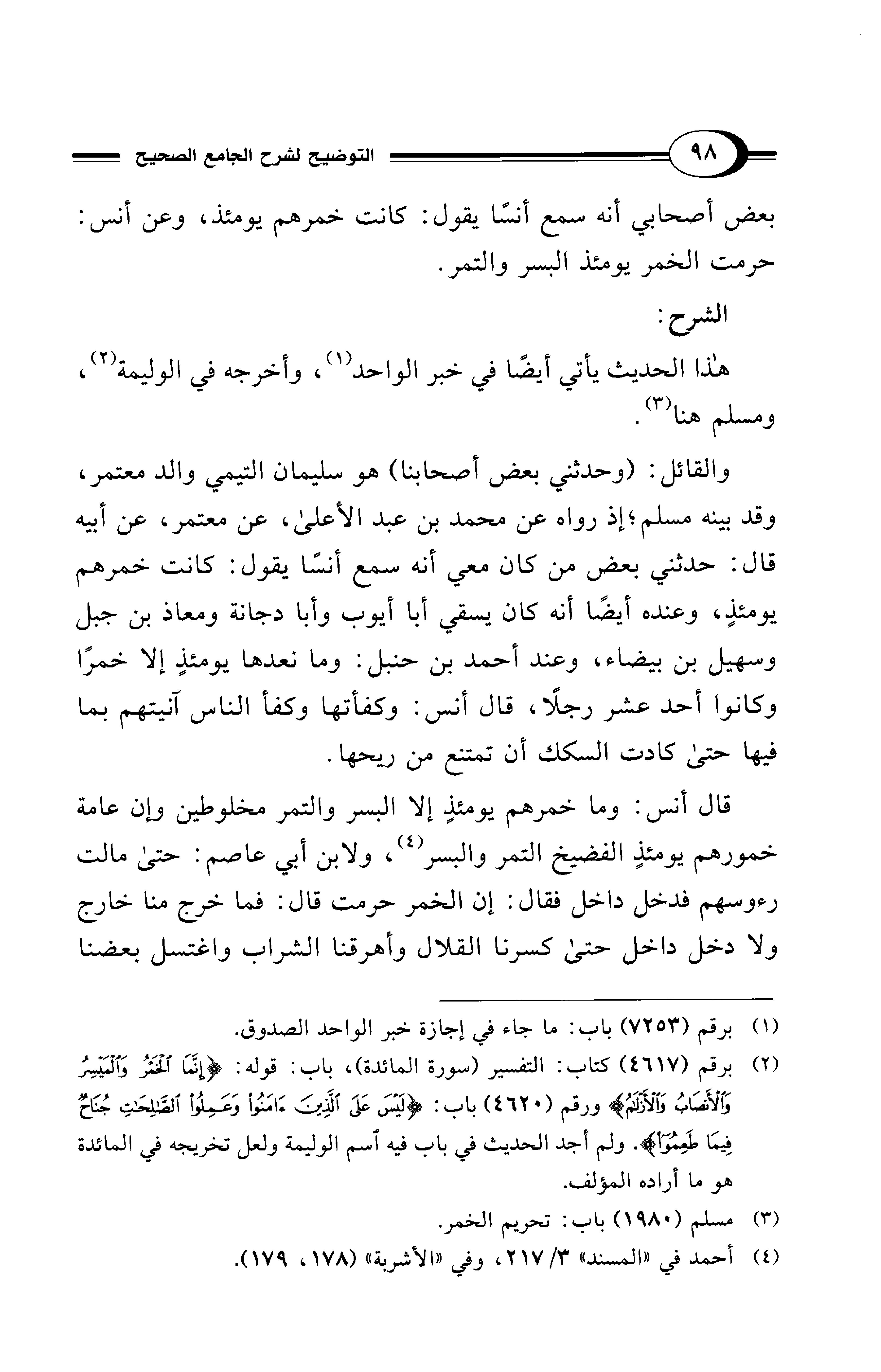 (¬2) برقم (4617) كتاب: التفسير (سورة المائدة)، باب: قوله: {إِنَّمَا الْخَمْرُ وَالْمَيْسِرُ وَالْأَنْصَابُ وَالْأَزْلَامُ} ورقم (4620) باب: {لَيْسَ على الَّذِينَ آمَنُوا وَعَمِلُوا الصَّالِحَاتِ جُنَاحٌ فِيمَا طَعِمُوا}. ولم أجد الحديث في باب فيه اسم الوليمة ولعل تخريجه في المائدة هو ما أراده المؤلف.