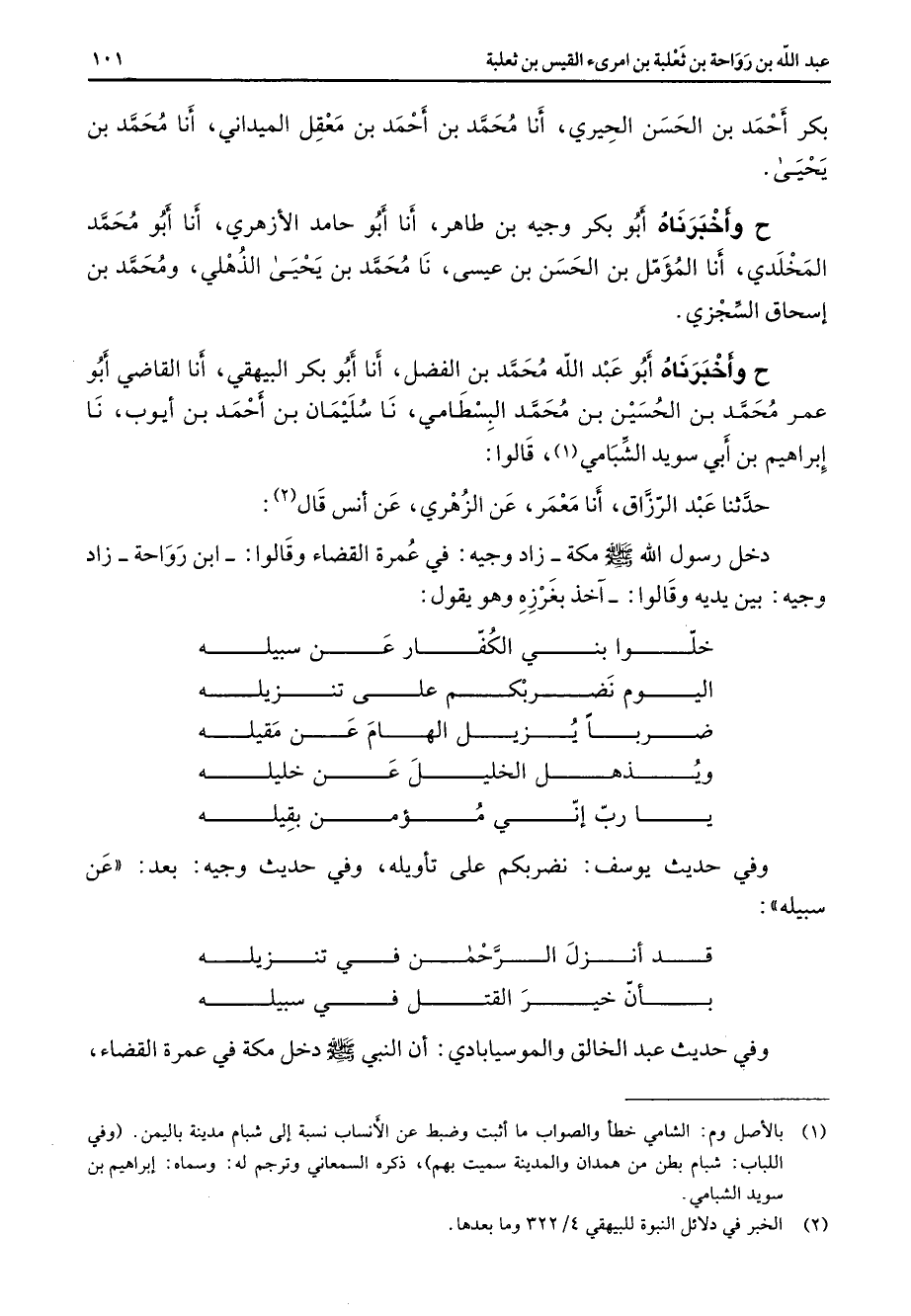 بكر أحمد بن الحسن الحيري أنا محمد بن أحمد بن معقل الميداني أنا محمد بن يحيى ح واخبرناه أبو بكر وجيه بن طاهر أنا أبو حامد الازهري أنا أبو محمد المخلدي أنا المؤمل بن الحسن بن عيسى نا محمد بن يحيى الذهلي ومحمد بن إسحاق السجزي ح واخبرناه أبو عبد الله محمد بن الفضل أنا أبو بكر البيهقي أنا القاضي أبو عمر محمد بن الحسين بن محمد البسطامي نا سليمان بن أحمد بن أيوب نا إبراهيم بن أبي سويد الشبامي (1) قالوا حدثنا عبد الرزاق أنا معمر عن الزهري عن انس قال (2) دخل رسول الله (صلى الله عليه وسلم) مكة زاد وجيه في عمرة القضاء وقالوا ابن رواحة زاد وجيه بين يديه وقالوا آخذ بغرزه وهو يقول * خلوا بني الكفار عن سبيله * اليوم نضربكم على تنزيله * ضربا يزيل الهام عن مقيله * ويذهل الخليل عن خليله * يا رب إني مؤمن بقيله وفي حديث يوسف نضربكم على تأويله وفي حديث وجيه بعد عن سبيله * قد انزل الرحمن في تنزيله * بأن خير القتل في سبيله وفي حديث عبد الخالق والموسيابادي ان النبي (صلى الله عليه وسلم) دخل مكة في عمرة القضاء