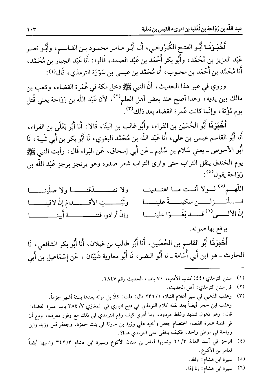 أخبرنا أبو الفتح الكروخي أنا أبو عامر محمود بن القاسم وأبو نصر عبد العزيز بن محمد وأبو بكر أحمد بن عبد الصمد قالوا أنا عبد الجبار بن محمد أنا محمد بن أحمد بن محبوب أنا محمد بن عيسى بن سورة الترمذي قال (1) وروي في غير هذا الحديث ان النبي (صلى الله عليه وسلم) دخل مكة في عمرة القضاء وكعب بن مالك بين يديه وهذا أصح عند بعض اهل العلم (2) لان عبد الله بن رواحة يعني قتل يوم مؤتة وانما كانت عمرة القضاء بعد ذلك (3) أخبرنا أبو الحسين بن الفراء وأبو غالب بن البنا قالا أنا أبو يعلى بن الفراء أنا أبو القاسم عيسى بن علي أنا عبد الله بن محمد البغوي نا أبو بكر بن أبي شيبة نا أبو الاحوص يعني سلام بن سليم عن أبي إسحاق عن البراء قال رايت النبي (صلى الله عليه وسلم) يوم الخندق ينقل التراب حتى وارى التراب شعر صدره وهو يرتجز برجز عبد الله بن رواحة يقول (4) * اللهم (5) لولا انت ما اهتدينا * ولا تصدقنا ولا صلينا فأنزلن سكينة علينا * وثبت الاقدام إن لاقينا إن الإلى (6) قد بغوا علينا * وإن أرادوا فتنة أبينا * يرفع بها صوته أخبرنا أبو القاسم بن الحصين أنا أبو طالب بن غيلان أنا أبو بكر الشافعي نا الحارث هو ابن أبي اسامة نا أبو النضر نا أبو معاوية شيبان عن إسماعيل بن أبي