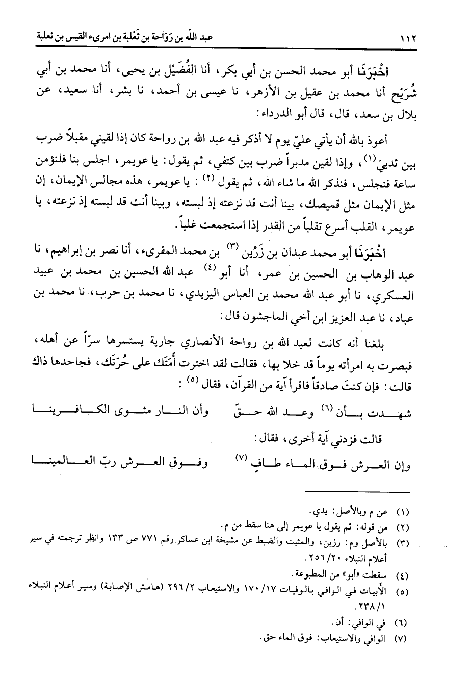 (5) الأبيات في الوافي بالوفيات 17 / 170 والاستيعاب 2 / 296 (هامش الإصابة) وسير أعلام النبلاء 1 / 238