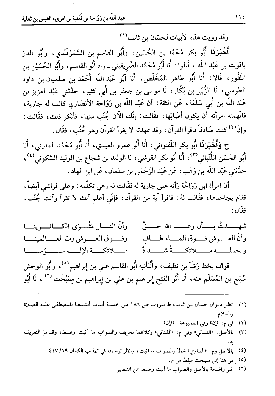 فقالت لولا انك قرأت وقد رويت هذه الأبيات لحسان بن ثابت (1) أخبرنا أبو بكر محمد بن الحسين وأبو القاسم بن السمرقندي وأبو الدر ياقوت بن عبد الله قالوا أنا أبو محمد الصريفيني زاد أبو القاسم وأبو الحسين بن النقور قالا أنا أبو طاهر المخلص أنا أبو عبد الله أحمد بن سليمان بن داود الطوسي نا الزبير بن بكار نا موسى بن جعفر بن أبي كثير حدثني عبد العزيز بن عبد الله بن أبي سلمة عن الثقة ان عبد الله بن رواحة الانصاري كانت له جارية فاتهمته امراته ان يكون اصابها فقالت انك الان جنب منها فانكر ذلك فقالت وان (2) كنت صادقا فاقرا القران وقد عهدته لا يقرا القران وهو جنب فقال ح وأخبرنا أبو بكر اللفتواني أنا أبو عمرو العبدي أنا أبو محمد المديني أنا أبو الحسن اللنباني (3) أنا أبو بكر القرشي نا الوليد بن شجاع بن الوليد السكوني (4) حدثني عبد الله بن وهب عن عبد الرحمن بن سلمان عن ابن الهاد ان امراة ابن رواحة راته على جارية له فقالت له وهي تكلمه وعلى فراشي ايضا فقام يجاحدها فقالت له فاقرا اية من القران فإني اعلم انك لا تقرا وانت جنب فقال * شهدت بان وعد الله حق * وان النار مثوى الكافرينا وان العرش فوق الماء طاف * وفوق العرش رب العالمينا وتحمله ملائكة شداد * ملائكة الإله مسومينا * قرأت بخط رشأ بن نظيف وأنبأنيه أبو القاسم علي بن إبراهيم (5) وأبو الوحش سبيع بن المسلم عنه أنا أبو الفتح إبراهيم بن علي بن إبراهيم بن سيبخت (6) نا أبو