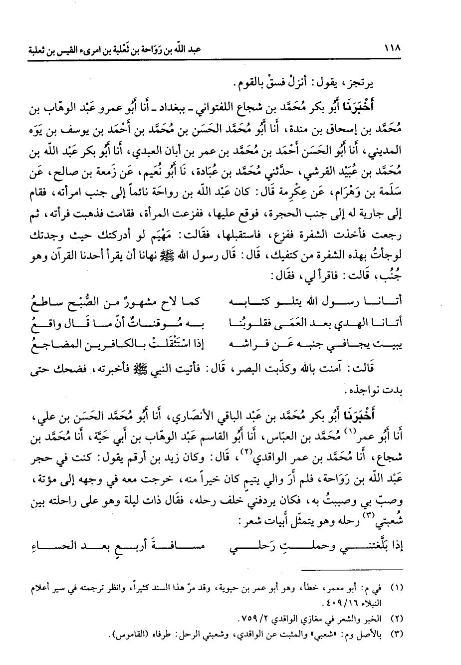 يرتجز يقول انزل فسق بالقوم أخبرنا أبو بكر محمد بن شجاع اللفتواني ببغداد أنا أبو عمرو عبد الوهاب بن محمد بن إسحاق بن مندة أنا أبو محمد الحسن بن محمد بن أحمد بن يوسف بن يوه المديني أنا أبو الحسن أحمد بن محمد بن عمر بن أبان العبدي أنا أبو بكر عبد الله بن محمد بن عبيد القرشي حدثني محمد بن عبادة نا أبو نعيم عن زمعة بن صالح عن سلمة بن وهرام عن عكرمة قال كان عبد الله بن رواحة نائما إلى جنب امراته فقام إلى جارية له إلى جنب الحجرة فوقع عليها ففزعت المراة فقامت فذهبت فراته ثم رجعت فاخذت الشفرة ففزع فاستقبلها فقالت مهيم لو ادركتك حيث وجدتك لوجأت بهذه الشفرة من كتفيك قال قال رسول الله (صلى الله عليه وسلم) نهانا ان يقرا احدنا القران وهو جنب قالت فاقرا لي فقال * اتانا رسول الله يتلو كتابه * كما لاح مشهور من الصبح ساطع اتانا الهدي بعد العمى فقلوبنا * به موقنات ان ما قال واقع يبيت يجافي جنبه عن فراشه * إذا استثقلت بالكافرين المضاجع * قالت آمنت بالله وكذبت البصر قال فاتيت النبي (صلى الله عليه وسلم) فاخبرته فضحك حتى بدت نواجذه أخبرنا أبو بكر محمد بن عبد الباقي الانصاري أنا أبو محمد الحسن بن علي أنا أبو عمر (1) محمد بن العباس أنا أبو القاسم عبد الوهاب بن أبي حية أنا محمد بن شجاع أنا محمد بن عمر الواقدي (2) قال وكان زيد بن ارقم يقول كنت في حجر عبد الله بن رواحة فلم ار والي يتيم كان خيرا منه خرجت معه في وجهه إلى مؤتة وصب بي وصببت به فكان يردفني خلف رحله فقال ذات ليلة وهو على راحلته بين شعبتي (3) رحله وهو يتمثل أبيات شعر * إذا بلغتني وحملت رحلي * مسافة اربع بعد الحساء