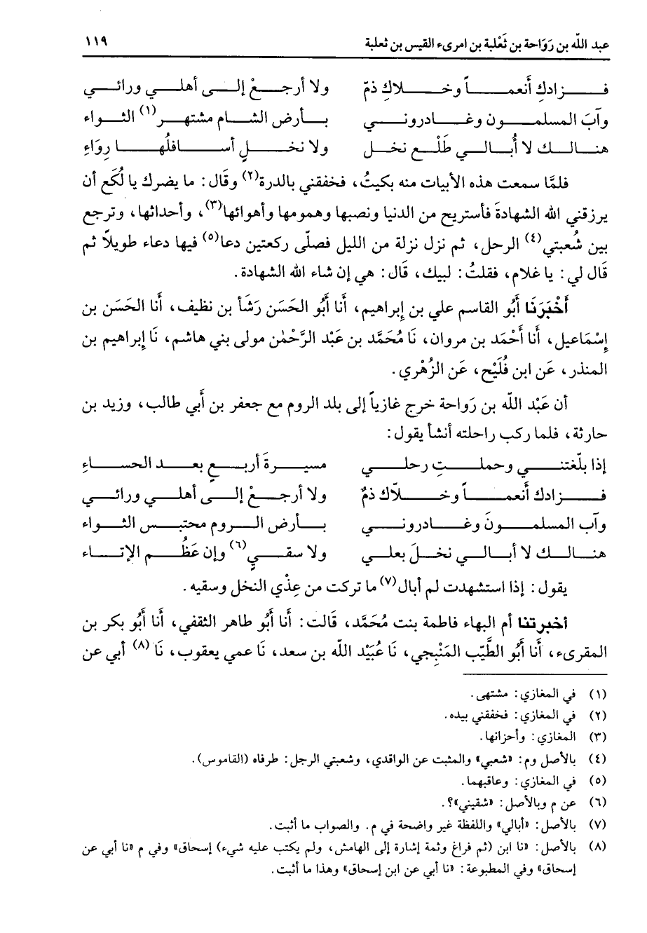 فزادك انعما وخلاك ذم * ولا ارجع إلى اهلي ورائي وآب المسلمون وغادروني * بارض الشام مشتهر (1) الثواء هنالك لا أبالي طلع نخل * ولا نخل اسافلها رواء * فلما سمعت هذه الأبيات منه بكيت فخفقني بالدرة (2) وقال ما يضرك يا لكع ان يرزقني الله الشهادة فاستريح من الدنيا نيا ونصبها وهمومها واهوائها (3) واحداثها وترجع بين شعبتي (4) الرحل ثم نزل نزلة من الليل فصلى ركعتين دعا (5) فيها دعاء طويل ثم قال لي يا غلام فقلت لبيك قال هي ان شاء الله الشهادة أخبرنا أبو القاسم علي بن إبراهيم أنا أبو الحسن رشأ بن نظيف أنا الحسن بن إسماعيل أنا أحمد بن مروان نا محمد بن عبد الرحمن مولي بني هاشم نا إبراهيم بن المنذر عن ابن فليح عن الزهري إن عبد الله بن رواحة خرج غازيا إلى بلد الروم مع جعفر ابن أبي طالب وزيد بن حارثة فلما ركب راحلته انشأ يقول * إذا بلغتني وحملت رحلي * مسيرة اربع بعد الحساء فزادك انعما وخلاك ذم * ولا ارجع إلى اهلي ورائي وآب المسلمون وغادروني * بارض الروم محتبس الثواء هنالك لا أبالي نخل بعلي * ولا سقي (6) وإن عظم الإتاء * يقول إذا استشهدت لم أبال (7) ما تركت من عذي النخل وسقيه اخبرتنا ام البهاء فاطمة بنت محمد قالت أنا أبو طاهر الثقفي أنا أبو بكر بن المقرئ أنا أبو الطيب المنبجي نا عبيد الله بن سعد نا عمي يعقوب نا (8) أبي عن