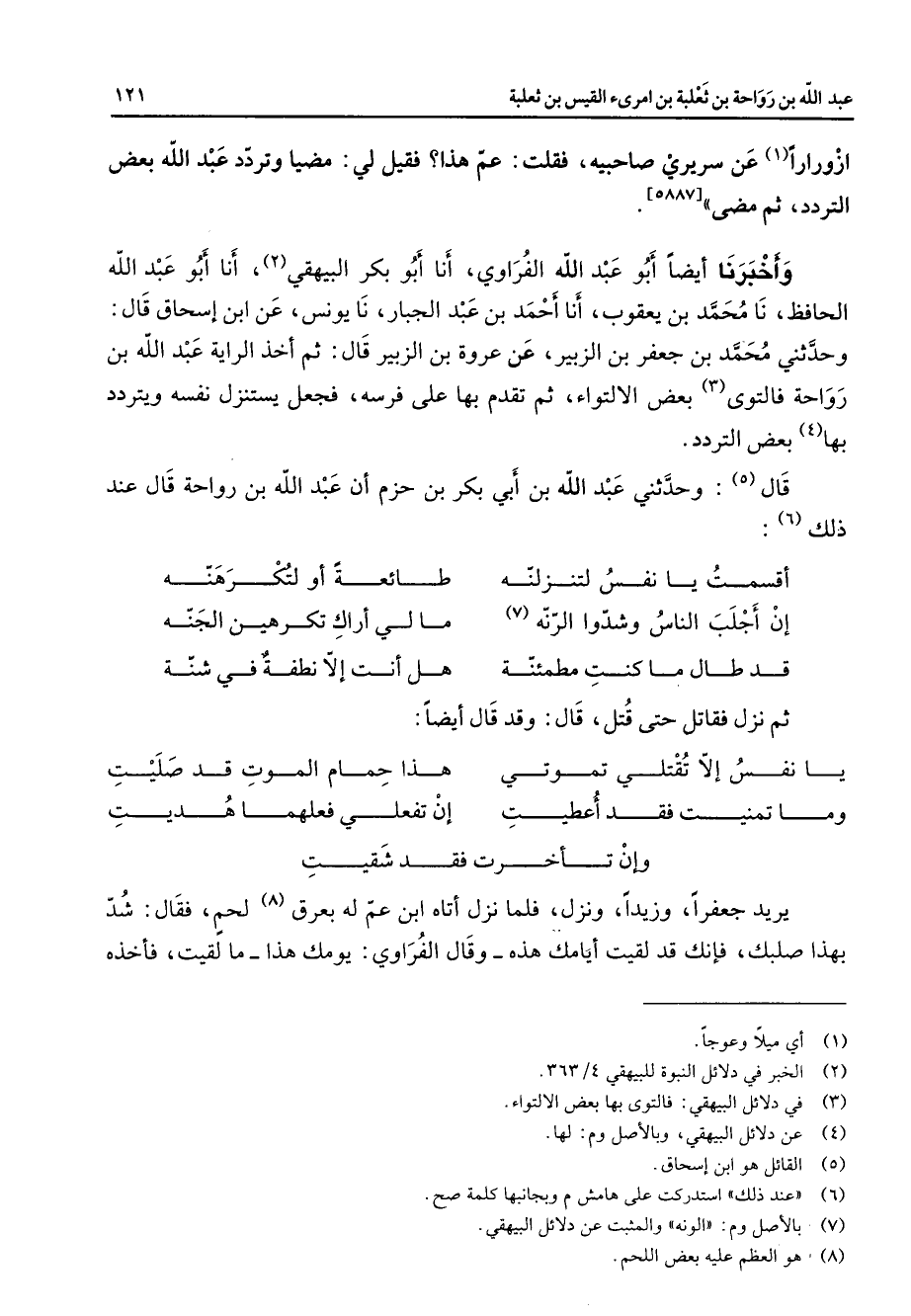 ازورارا (1) عن سريري صاحبيه فقلت عم هذا فقيل لي مضيا وتردد عبد الله بعض التردد ثم مضى وأخبرنا ايضا أبو عبد الله الفراوي أنا أبو بكر البيهقي (2) أنا أبو عبد الله الحافظ نا محمد بن يعقوب أنا أحمد بن عبد الجبار نا يونس عن ابن إسحاق قال وحدثني محمد بن جعفر بن الزبير عن عروة بن الزبير قال ثم أخذ الراية عبد الله بن رواحة فالتوى (3) بعض الالتواء ثم تقدم بها على فرسه فجعل يستنزل نفسه ويتردد بها (4) بعض التردد قال (5) وحدثني عبد الله بن أبي بكر بن حزم ان عبد الله بن رواحة قال عند ذلك (6) * أقسمت يا نفس لتنزلنه * طائعة أو لتكرهنه إن جلب الناس وشدوا الرنة (7) * مالي اراك تكرهين الجنة قد طال ما كنت مطمئنة * هل انت إلا نطفة في شنة * ثم نزل فقاتل حتى قتل قال وقد قال ايضا * يا نفس الا تقتلي تموتي * هذا حمام الموت قد صليت وما تمنيت فقد اعطيت * ان تفعلي فعلهما هديت وان تأخرت فقد شقيت يريد جعفرا وزيدا ونزل فلما نزل اتاه ابن عم له بعرق (8) لحم فقال شد بهذا صلبك فانك قد لقيت ايامك هذه وقال الفراوي يومك هذا ما لقيت فاخذه