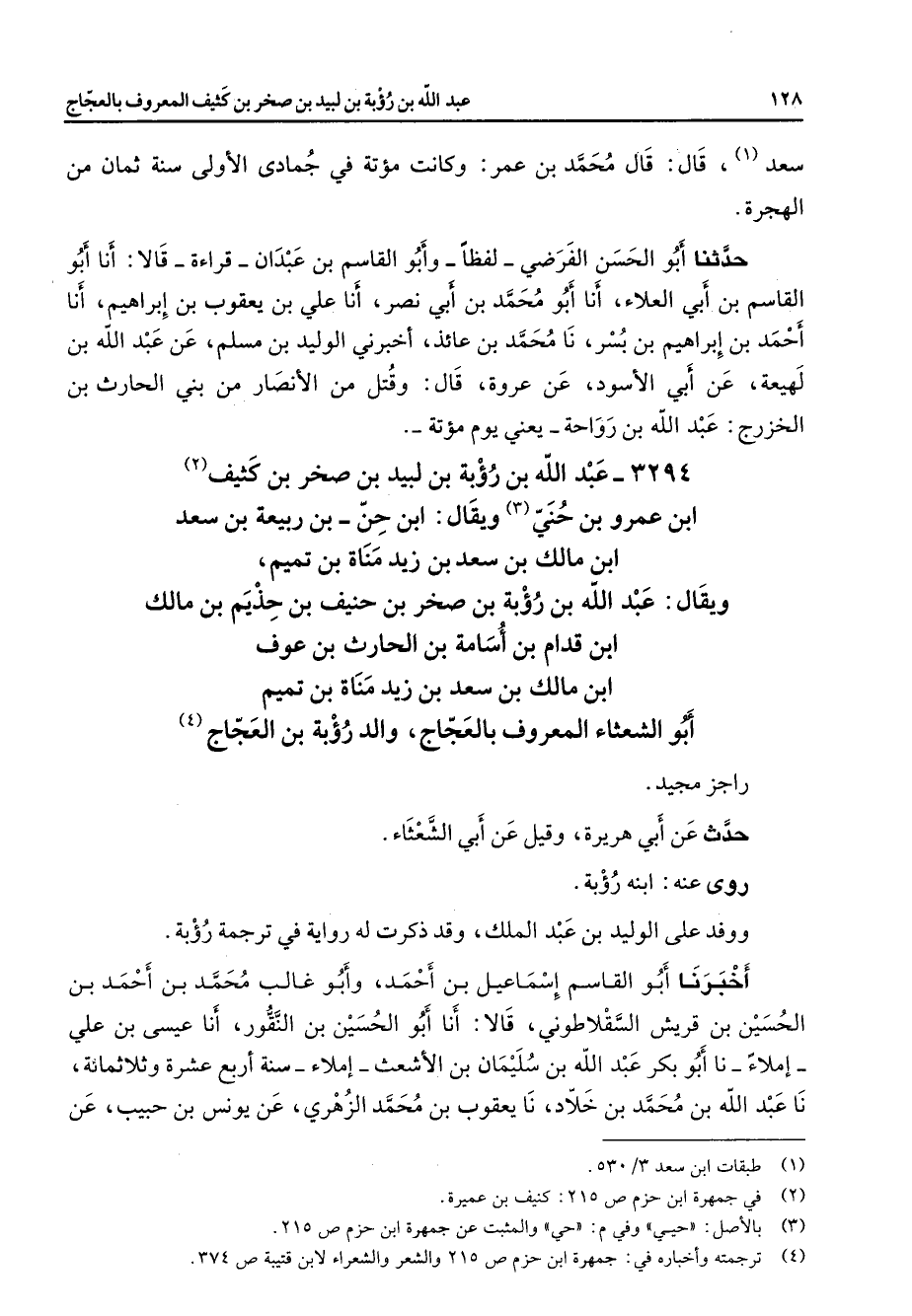 3294 - عبد الله بن رؤبة بن لبيد بن صخر بن كثيف (2) ابن عمرو بن حني (3) ويقال ابن حن بن ربيعة بن سعد ابن مالك بن سعد بن زيد مناة بن تميم ويقال عبد الله بن رؤبة بن صخر بن حنيف بن حذيم بن مالك ابن قدام بن اسامة بن الحارث بن عوف ابن مالك بن سعد بن زيد مناة بن تميم أبو الشعثاء المعروف بالعجاج والد رؤبة بن العجاج (4) راجز مجيد حدث عن أبي هريرة وقيل عن أبي الشعثاء روى عنه ابنه رؤبة ووفد على الوليد بن عبد الملك وقد ذكرت له رواية في ترجمة رؤبة أخبرنا أبو القاسم إسماعيل بن أحمد وأبو غالب محمد بن أحمد بن الحسين بن قريش السقلاطوني قالا أنا أبو الحسين بن النقور أنا عيسى بن علي املاء نا أبو بكر عبد الله بن سليمان بن الاشعث املاء سنة اربع عشرة وثلاثمائة نا عبد الله بن محمد بن خلاد نا يعقوب بن محمد الزهري عن يونس بن حبيب عن
