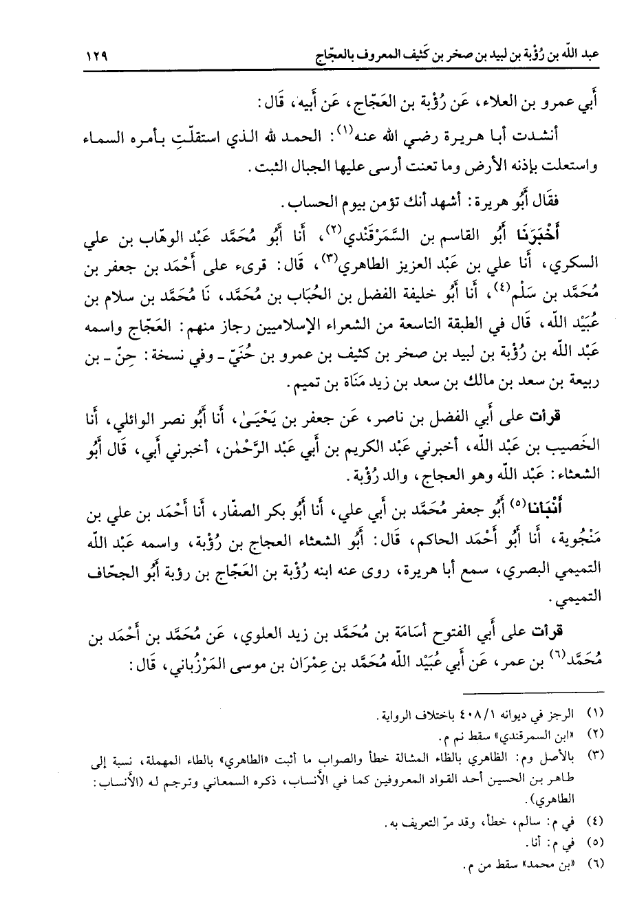 أبي عمرو بن العلاء عن رؤبة بن العجاج عن أبيه قال انشدت أبا هريرة Bهـ (1) الحمدلله الذي استقلت بامره السماء واستعلت باذنه الارض وما تعنت ارسى عليها الجبال الثبت فقال أبو هريرة اشهد انك تؤمن بيوم الحساب أخبرنا أبو القاسم بن السمرقندي (2) أنا أبو محمد عبد الوهاب بن علي السكري أنا علي بن عبد العزيز الطاهري (3) قال قرئ على أحمد بن جعفر بن محمد بن سلم (4) أنا أبو خليفة الفضل بن الحباب بن محمد نا محمد بن سلام بن عبيد الله قال في الطبقة التاسعة من الشعراء الإسلاميين رجاز منهم العجاج واسمه عبد الله بن رؤبة بن لبيد بن صخر بن كثيف بن عمرو بن حني وفي نسخة حن بن ربيعة بن سعد بن مالك بن سعد بن زيد مناة بن تميم قرأت على أبي الفضل بن ناصر عن جعفر بن يحيى أنا أبو نصر الوائلي أنا الخصيب بن عبد الله اخبرني عبد الكريم بن أبي عبد الرحمن اخبرني أبي قال أبو الشعثاء عبد الله وهو العجاج والد رؤبة انبأنا (5) أبو جعفر محمد بن أبي علي أنا أبو بكر الصفار أنا أحمد بن علي بن منجوية أنا أبو أحمد الحاكم قال أبو الشعثاء العجاج بن رؤبة واسمه عبد الله التميمي البصري سمع أبا هريرة روى عنه ابنه رؤبة بن العجاج بن رؤبة أبو الجحاف التميمي قرأت على أبي الفتوح اسامة بن محمد بن زيد العلوي عن محمد بن أحمد بن محمد (6) بن عمر عن أبي عبيد الله محمد بن عمران بن موسى المرزباني قال