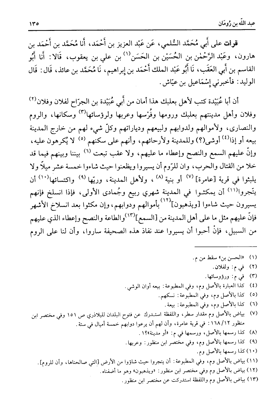 قرأت على أبي محمد السلمي عن عبد العزيز بن أحمد أنا محمد بن أحمد بن هارون وعبد الرحمن بن الحسين بن الحسن (1) بن علي بن يعقوب قالا أنا أبو القاسم بن أبي العقب نا أبو عبد الملك أحمد بن إبراهيم نا محمد بن عائذ قال قال الوليد فاخبرني إسماعيل بن عياش أن أبا عبيدة كتب لأهل بعلبك هذا امان من أبي عبيدة بن الجراح لفلان وفلان (2) وفلان واهل مدينتهم بعلبك ورومها وفرسها وعربها ولرؤسائها (3) وسكانها والروم والنصارى ولأموالهم ولدوابهم ولبيعهم ودياراتهم وكل شئ لهم من خارج المدينة بيعه أو إذا (4) اوشى وللمدينة ولأرحائهم وانهم على سكنهم (5) لا يكرهون عليه وان عليهم السمع والنصح واعطاء ما عليهم ولا عقب تبعت (6) بيننا وبينهم فيما قد خلا من القتال والحرب وان للروم ان يسيروا ويظعنوا حيث شاءوا خمسة عشر ميلا ولا يلبثوا في قرية عامرة (7) أو بنية (8) ولاهل المدينة وريها (9) واكتسائها (10) ان يتجروا (11) ان يمكثوا في المدينة شهري ربيع وجمادى الاولى فإذا انسلخ فانهم يسيرون حيثوا شاءوا ويذهبون (12) باموالهم ودوابهم وان مكثوا بعد انسلاخ الاشهر فان عليهم مثل ما على اهل المدينة من السمع (13) والطاعة والنصح واعطاء الذي عليهم من السبيل فان احبوا ان يسيروا عند نفاذ هذه الصحيفة ساروا وأن لنا على الروم