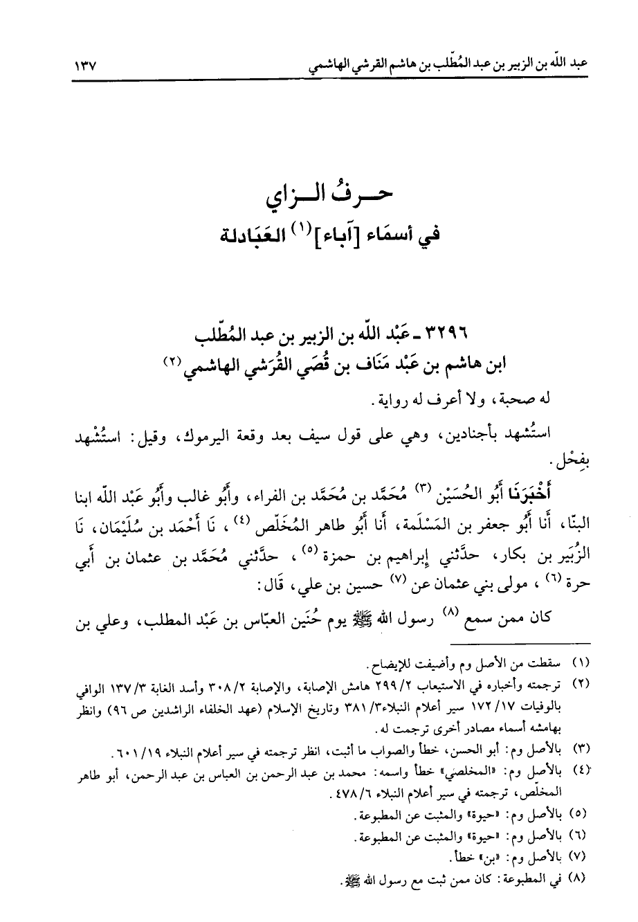 3296 - عبد الله بن الزبير بن عبد المطلب بن هاشم بن عبد مناف بن قصي القرشي الهاشمي (2) له صحبة ولا اعرف له رواية استشهد بأجنادين وهي على قول سيف بعد وقعة اليرموك وقيل استشهد بفحل أخبرنا أبو الحسين (3) محمد بن محمد بن الفراء وأبو غالب وأبو عبد الله ابنا البنا أنا أبو جعفر بن المسلمة أنا أبو طاهر المخلص (4) نا أحمد بن سليمان نا الزبير بن بكار حدثني إبراهيم بن حمزة (5) حدثني محمد بن عثمان بن أبي حرة (6) مولى بني عثمان عن (7) حسين بن علي قال كان ممن سمع (8) رسول الله (صلى الله عليه وسلم) يوم حنين العباس بن عبد المطلب وعلي بن