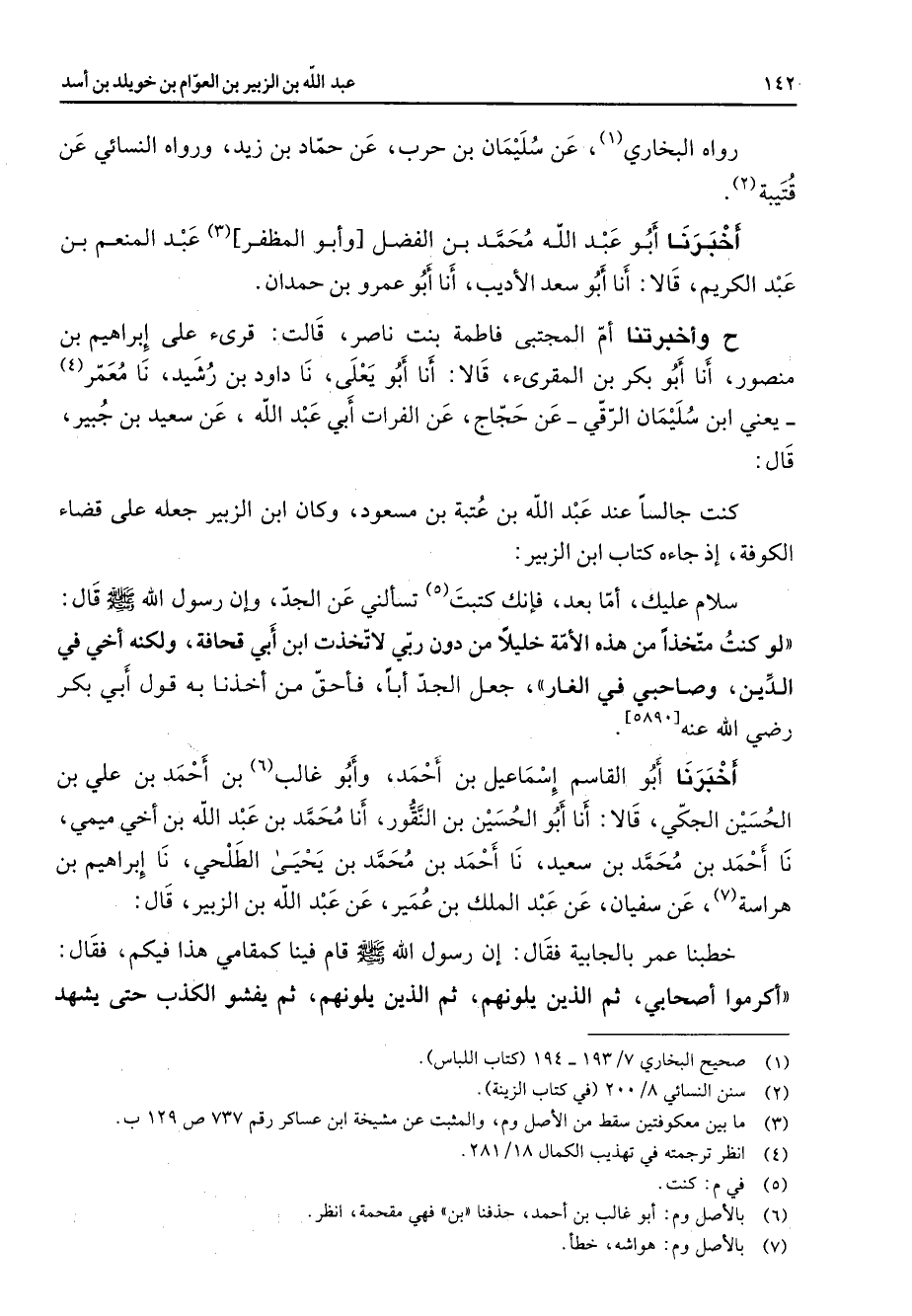 رواه البخاري (1) عن سليمان بن حرب عن حماد بن زيد ورواه النسائي عن قتيبة (2) أخبرنا أبو عبد الله محمد بن الفضل وأبو المظفر (3) عبد المنعم بن عبد الكريم قالا أنا أبو سعد الاديب أنا أبو عمرو بن حمدان ح واخبرتنا ام المجتبى فاطمة بنت ناصر قالت قرئ على إبراهيم بن منصور أنا أبو بكر بن المقرئ قالا أنا أبو يعلى نا داود بن رشيد نا معمر (4) يعني ابن سليمان الرقي عن حجاج عن الفرات أبي عبد الله عن سعيد بن جبير قال كنت جالسا عبد عبد الله بن عتبة بن مسعود وكان ابن الزبير جعله على قضاء الكوفة إذ جاءه كتاب ابن الزبير سلام عليك اما بعد فإنك كتبت (5) تسألني عن الجد وإن رسول الله (صلى الله عليه وسلم) قال لو كنت متخذا من هذه الأمة خليلا من دون ربي لاتخذت ابن أبي قحافة ولكنه اخي في الدين وصاحبي في الغار جعل الجد أبا فأحق من أخذنا به قول أبي بكر Bهـ أخبرنا أبو القاسم إسماعيل بن أحمد وأبو غالب (6) بن أحمد بن علي بن الحسين الجكي قالا أنا أبو الحسين بن النقور أنا محمد بن عبد الله بن اخي ميمي نا أحمد بن محمد بن سعيد نا أحمد بن محمد ين يحيى الطلحي نا إبراهيم بن هراسة (7) عن سفيان عن عبد الملك بن عمير عن عبد الله بن الزبير قال خطبنا عمر بالجابية فقال إن رسول الله (صلى الله عليه وسلم) قام فينا كمقامي هذا فيكم فقال اكرموا اصحابي ثم الذين يلونهم ثم الذين يلونهم ثم يفشو الكذب حتى يشهد