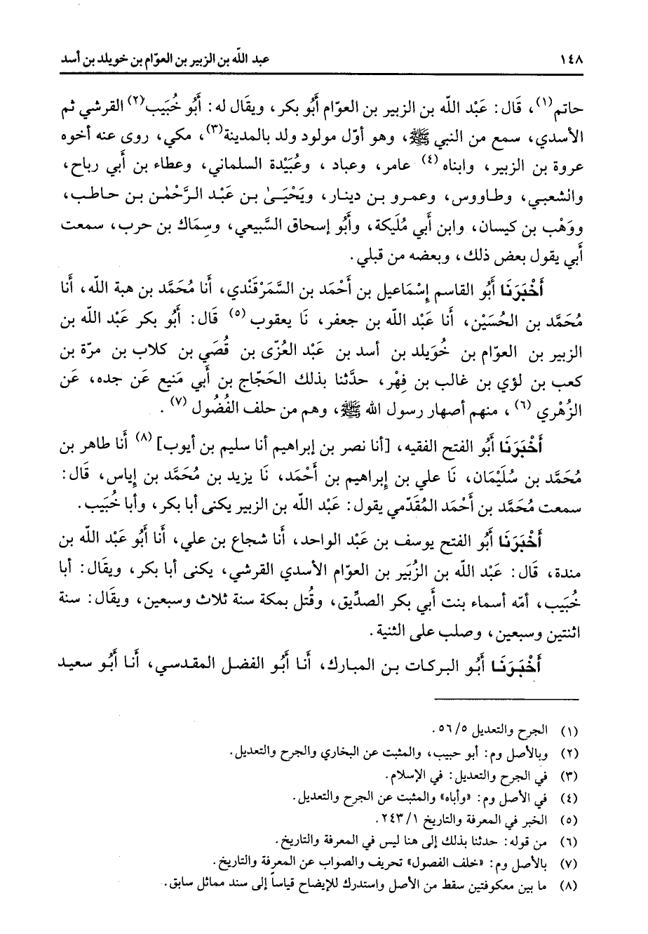 حاتم (1) قال عبد الله بن الزبير بن العوام أبو بكر ويقال له أبو خبيب (2) القرشي ثم الاسدي سمع من النبي (صلى الله عليه وسلم) وهو اول مولود ولد بالمدينة (3) مكي روى عنه اخوه عروة بن الزبير وابناه (4) عامر وعباد وعبيدة السلماني وعطاء بن أبي رباح والشعبي وطاووس وعمرو بن دينار ويحيى بن عبد الرحمن بن حاطب ووهب بن كيسان وابن أبي مليكة وأبو إسحاق السبيعي وسماك بن حرب سمعت أبي يقول بعض ذلك وبعضه من قبلي أخبرنا أبو القاسم إسماعيل بن أحمد بن السمرقندي أنا محمد بن هبة الله أنا محمد بن الحسين أنا عبد الله بن جعفر نا يعقوب (5) قال أبو بكر عبد الله بن الزبير بن العوام بن خويلد بن اسد بن عبد العزى بن قصي بن كلاب بن مرة بن كعب بن لؤي بن غالب بن فهر حدثنا بذلك الحجاج بن أبي منيع عن جده عن الزهري (6) منهم اصهار رسول الله (صلى الله عليه وسلم) وهم من حلف الفضول (7) أخبرنا أبو الفتح الفقيه أنا نصر بن إبراهيم أنا سليم بن أيوب (8) أنا طاهر بن محمد بن سليمان نا علي بن إبراهيم بن أحمد نا يزيد بن محمد ين إياس قال سمعت محمد بن أحمد المقدمي يقول عبد الله بن الزبير يكنى أبا بكر وأبا خبيب أخبرنا أبو الفتح يوسف بن عبد الواحد أنا شجاع بن علي أنا أبو عبد الله بن مندة قال عبد الله بن الزبير بن العوام الاسدي القرشي يكنى أبا بكر ويقال أبا خبيب امه اسماء بنت أبي بكر الصديق وقتل بمكة سنة ثلاث وسبعين ويقال سنة اثنتين وسبعين وصلب على الثنية أخبرنا أبو البركات بن المبارك أنا أبو الفضل المقدسي أنا أبو سعيد
