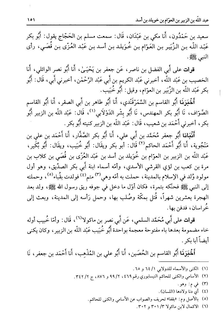 سعيد بن حمدون أنا مكي بن عبدان قال سمعت مسلم بن الحجاج يقول أبو بكر عبد الله بن الزبير بن العوام بن خويلد بن اسد بن عبد العزى بن قصي راى النبي (صلى الله عليه وسلم) قرأت على أبي الفضل بن ناصر عن جعفر بن يحيى أنا أبو نصر الوائلي أنا الخصيب بن عبد الله اخبرني عبد الكريم بن أبي عبد الرحمن اخبرني أبي قال أبو بكر عبد الله بن الزبير بن العوام وقيل أبو خبيب أخبرنا أبو القاسم بن السمرقندي أنا أبو طاهر بن أبي الصقر أنا أبو القاسم الصواف نا أبو بكر المهندس نا أبو بشر الدولأبي (1) قال عبد الله بن الزبير أبو بكر اخبرني أحمد بن شعيب قال عبد الله بن الزبير كنيته أبو بكر انبأنا أبو جعفر محمد بن أبي علي أنا أبو بكر الصفار أنا أحمد بن علي بن منجوية أنا أبو أحمد الحاكم (2) قال أبو بكر ويقال أبو خبيب ويقال أبو بكير عبد الله بن الزبير بن العوام خويلد بن اسد بن عبد العزى بن قصي بن كلاب بن مرة بن كعب بن لؤي القرشي الاسدي وامه اسماء ابنة أبي بكر الصديق وهو اول مولود ولد في الاسلام بالمدينة حملت به امه وهي (3) متم (4) فولدت بقباء (5) وحملته إلى النبي (صلى الله عليه وسلم) فحنكه بتمرة فكان اول ما دخل في جوفه ريق رسول الله (صلى الله عليه وسلم) ولد بعد الهجرة بعشرين شهرا قتل بمكة وصلب بها وحمل راسه إلى المدينة وبعث إلى خراسان فدفن بها قرأت على أبي محمد السلمي عن أبي نصر بن ماكولا (6) قال واما خبيب اوله خاء مضمومة بعدها باء مفتوحة معجمة بواحدة أبو خبيب عبد الله بن الزبير وكان يكنى ايضا أبا بكر أخبرنا أبو القاسم بن الحصين أنا أبو علي بن المذهب أنا أحمد بن جعفر نا