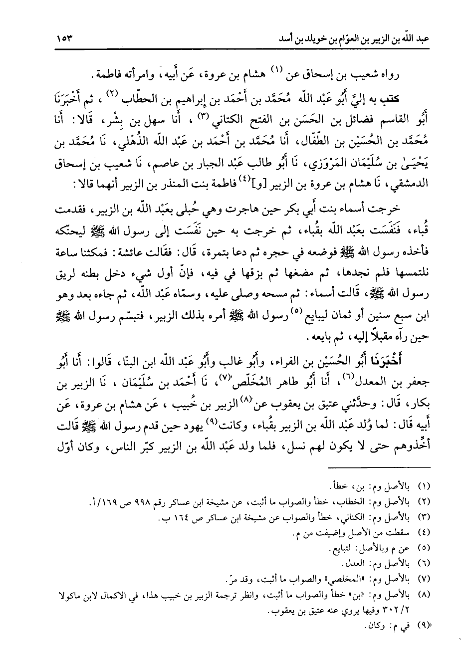 رواه شعيب بن إسحاق عن (1) هشام بن عروة عن أبيه وامراته فاطمة كتب به الي أبو عبد الله محمد بن أحمد بن إبراهيم بن الحطاب (2) ثم أخبرنا أبو القاسم فضائل بن الحسن بن الفتح الكتاني (3) أنا سهل بن بشر قالا أنا محمد بن الحسين بن الطفال أنا محمد بن أحمد بن عبد الله الذهلي نا محمد بن يحيى بن سليمان المروزي نا أبو طالب عبد الجبار بن عاصم نا شعيب بن إسحاق الدمشقي نا هشام بن عروة بن الزبير و (4) فاطمة بنت المنذر بن الزبير انهما قالا خرجت اسماء بنت أبي بكر حين هاجرت وهي حبلى بعبد الله بن الزبير فقدمت قباء فنفست بعبد الله بقباء ثم خرجت به حين نفست إلى رسول الله (صلى الله عليه وسلم) ليحنكه فاخذه رسول الله (صلى الله عليه وسلم) فوضعه في حجره ثم دعا بتمرة قال فقالت عائشة فمكثنا ساعة نلتمسها فلم نجدها ثم مضغها ثم بزقها في فيه فان اول شئ دخل بطنه لريق رسول الله (صلى الله عليه وسلم) قالت اسماء ثم مسحه وصلى عليه وسماه عبد الله ثم جاءه بعد وهو ابن سبع سنين أو ثمان ليبايع (5) رسول الله (صلى الله عليه وسلم) امره بذلك الزبير فتبسم رسول الله (صلى الله عليه وسلم) حين رآه مقبلا إليه ثم بايعه أخبرنا أبو الحسين بن الفراء وأبو غالب وأبو عبد الله ابن البنا قالوا أنا أبو جعفر بن المعدل (6) أنا أبو طاهر المخلص (7) نا أحمد بن سليمان نا الزبير بن بكار قال وحدثني عتيق بن يعقوب عن (8) الزبير بن خبيب عن هشام بن عروة عن أبيه قال لما ولد عبد الله بن الزبير بقباء وكانت (9) يهود حين قدم رسول الله (صلى الله عليه وسلم) قالت اخذوهم حتى لا يكون لهم نسل فلما ولد عبد الله بن الزبير كبر الناس وكان اول