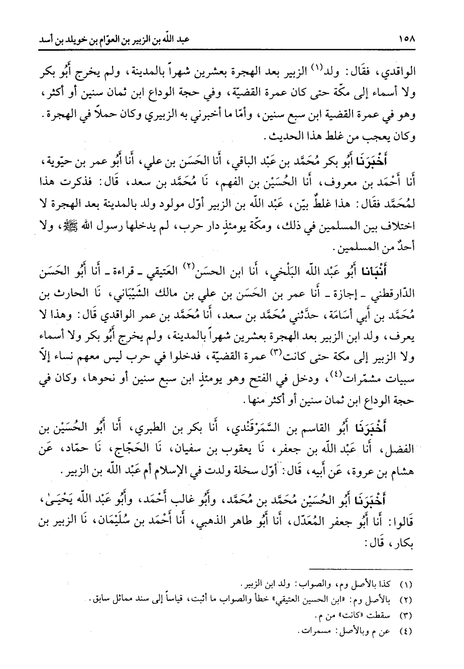 الواقدي فقال ولد (1) الزبير بعد الهجرة بعشرين شهرا بالمدينة ولم يخرج أبو بكر ولا اسماء إلى مكة حتى كان عمرة القضية وفي حجة الوداع ابن ثمان سنين أو اكثر وهو في عمرة القضية ابن سبع سنين واما ما اخبرني به الزبيري وكان حملا في الهجرة وكان يعجب من غلط هذا الحديث أخبرنا أبو بكر محمد بن عبد الباقي أنا الحسن بن علي أنا أبو عمر بن حيوية أنا أحمد بن معروف أنا الحسين بن الفهم نا محمد بن سعد قال فذكرت هذا لمحمد فقال هذا غلط بين عبد الله بن الزبير اول مولود ولد بالمدينة بعد الهجرة لا اختلاف بين المسلمين في ذلك ومكة يومئذ دار حرب لم يدخلها رسول الله (صلى الله عليه وسلم) ولا احد من المسلمين انبأنا أبو علي البلخي أنا ابن الحسن (2) العتيقي قراءة أنا أبو الحسن الدارقطني اجازة أنا عمر بن الحسن بن علي بن مالك الشيباني نا الحارث بن محمد بن أبي اسامة حدثني محمد بن سعد أنا محمد بن عمر الواقدي قال وهذا لا يعرف ولد ابن الزبير بعد الهجرة بعشرين شهرا بالمدينة ولم يخرج أبو بكر ولا اسماء ولا الزبير إلى مكة حتى كانت (3) عمرة القضية فدخلوا في حرب ليس ومعهم نساء الا سبيات مشمرات (4) ودخل في الفتح وهو يومئذ ابن سبع سنين أو نحوها وكان في حجة الوداع ابن ثمان سنين أو اكثر منها أخبرنا أبو القاسم بن السمرقندي أنا بكر بن الطبري أنا أبو الحسين بن الفضل أنا عبد الله بن جعفر نا يعقوب بن سفيان نا الحجاج نا حماد عن هشام بن عروة عن أبيه قال اول سخلة ولدت في الاسلام ام عبد الله بن الزبير أخبرنا أبو الحسين محمد بن محمد وابو غالب أحمد وأبو عبد الله يحيى قالوا أنا أبو جعفر المعدل أنا أبو طاهر الذهبي أنا أحمد بن سليمان نا الزبير بن بكار قال