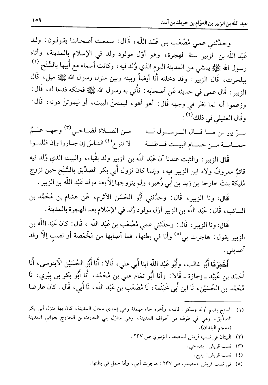 وحدثني عمي مصعب بن عبد الله قال سمعت اصحابنا يقولون ولد عبد الله بن الزبير سنة الهجرة وهو اول مولود ولد في الاسلام بالمدينة واتاه رسول الله (صلى الله عليه وسلم) يمشي من المدينة اليوم الذي ولد فيه وكانت اسماء مع أبيها بالسنح (1) ببلحرت قال الزبير وقد دخلته أنا ايضا وبينه وبين منزل رسول الله (صلى الله عليه وسلم) ميل قال الزبير قال عمي في حديثه عن اصحابه فاتي به رسول الله (صلى الله عليه وسلم) فحنكه فدعا له قال وزعموا انه لما نظر في وجهه قال اهو اهو ليمنعن البيت أو ليموتن دونه قال وقال العقيلي في ذلك * (2) بر يبين ما قال الرسول له * من الصلاة لضاحي (3) وجهه علم حمامة من حمام البيت قاطنة * لا تتبع (4) الناس ان جاروا وان ظلموا * قال الزبير والنبت عندنا ان عبد الله بن الزبير ولد بقباء والبيت الذي ولد فيه قائم معروف ولاذ ابن الزبير فيه وانما كان نزول أبي بكر الصديق بالسنح حين تزوج مليكة بنت خارجة بن زيد بن أبي زهير ولم يتزوجها الا بعد مولد عبد الله بن الزبير قال ونا الزبير قال وحدثني أبو الحسن الاثرم عن هشام بن محمد بن السائب قال عبد الله بن الزبير اول مولود ولد في الاسلام بعد الهجرة بالمدينة قال ونا الزبير قال وحدثني عمي مصعب بن عبد الله قال كان عبد الله بن الزبير يقول هاجرت بي (5) وأنا في بطنها فما اصابها من مخمصة أو نصب الا وقد اصابني أخبرنا أبو غالب وأبو عبد الله ابنا أبي علي قالا أنا أبو الحسين الآبنوسي أنا أحمد بن عبيد اجازة قالا وأنا أبو تمام علي بن محمد أنا أبو بكر بن بيري نا محمد بن الحسين نا ابن أبي خيثمة نا مصعب بن عبد الله نا أبي قال كان عارضا
