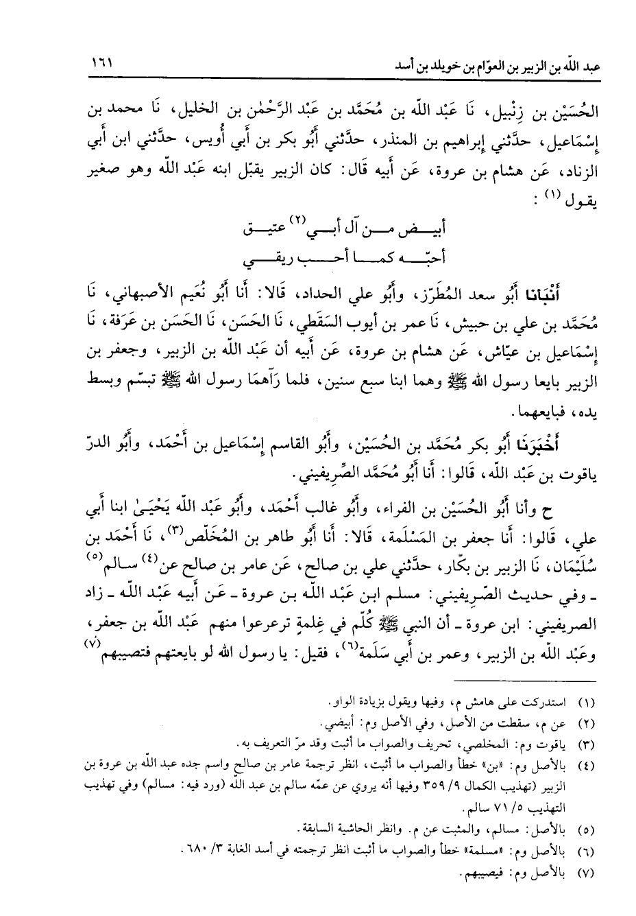 الحسين بن زنبيل نا عبد الله بن محمد بن عبد الرحمن بن الخليل نا محمد بن إسماعيل حدثني إبراهيم بن المنذر حدثني أبو بكر بن أبي اويس حدثني ابن أبي الزناد عن هشام بن عروة عن أبيه قال كان الزبير يقبل ابنه عبد الله وهو صغير يقول (1) * أبيض من آل أبي (2) عتيق * احبه كما احب ريقي انبأنا أبو سعد المطرز وأبو علي الحداد قالا أنا أبو نعيم الاصبهاني نا محمد بن علي بن حبيش نا عمر بن أيوب السقطي نا الحسن نا الحسن بن عرفة نا إسماعيل بن عياش عن هشام بن عروة عن أبيه ان عبد الله بن الزبير وجعفر بن الزبير بايعا رسول الله (صلى الله عليه وسلم) وهما ابنا سبع سنين فلما رآهما رسول الله (صلى الله عليه وسلم) تبسم وبسط يده فبايعهما أخبرنا أبو بكر محمد بن الحسين وأبو القاسم إسماعيل بن أحمد وأبو الدر ياقوت بن عبد الله قالوا أنا أبو محمد الصريفيني ح وأنا أبو الحسين بن الفراء وأبو غالب أحمد وأبو عبد الله يحيى ابنا أبي علي قالوا أنا جعفر بن المسلمة قالا أنا أبو طاهر بن المخلص (3) نا أحمد بن سليمان نا الزبير بن بكار حدثني علي بن صالح عن عامر بن صالح عن (4) سالم (5) وفي حديث الصريفيني مسلم ابن عبد الله بن عروة عن أبيه عبد الله زاد الصريفيني ابن عروة ان النبي (صلى الله عليه وسلم) كلم في غلمة ترعرعوا منهم عبد الله بن جعفر وعبد الله بن الزبير وعمر بن أبي سلمة (6) فقيل يا رسول الله لو بايعتم فتصيبهم (7)