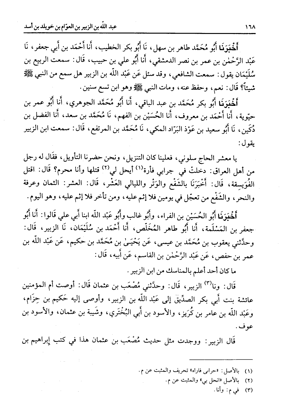 يريد قصبات السبق أخبرنا أبو محمد طاهر بن سهل نا أبو بكر الخطيب أنا أحمد بن أبي جعفر نا عبد الرحمن بن عمر بن نصر الدمشقي أنا أبو علي بن حبيب قال سمعت الربيع بن سليمان يقول سمعت الشافعي وقد سئل عن عبد الله بن الزبير هل سمع من النبي (صلى الله عليه وسلم) شيئا قال نعم وحفظ عنه ومات النبي (صلى الله عليه وسلم) وهو ابن تسع سنين أخبرنا أبو بكر محمد بن عبد الباقي أنا أبو محمد الجوهري أنا أبو عمر بن حيوية أنا أحمد بن معروف أنا الحسين بن الفهم نا محمد بن سعد أنا الفضل بن دكين نا أبو سعيد بن عوذ البراد المكي نا محمد بن المرتفع قال سمعت ابن الزبير يقول يا معشر الحاج سلوني فعلينا كان التنزيل ونحن حضرنا التأويل فقال له رجل من اهل العراق دخلت في جرابي فأرة (1) أيحل لي (2) قتلها وأنا محرم قال اقتل الفويسقة قال أخبرنا بالشفع والوتر والليالي العشر قال العشر الثمان وعرفة والنحر والشفع من تعجل في يومين فلا اثم عليه ومن تأخر فلا اثم عليه وهو اليوم أخبرنا أبو الحسين بن الفراء وأبو غالب وأبو عبد الله ابنا أبي علي قالوا أنا أبو جعفر بن المسلمة أنا أبو طاهر المخلص أنا أحمد بن سليمان نا الزبير قال وحدثني يعقوب بن محمد بن عيسى عن يحيى بن محمد بن حكيم عن عبد الله بن عمر بن حفص عن عبد الرحمن بن القاسم عن أبيه قال ما كان احد اعلم بالمناسك من ابن الزبير قال ونا (3) الزبير قال وحدثني مصعب بن عثمان قال اوصت ام المؤمنين عائشة بنت أبي بكر الصديق إلى عبد الله بن الزبير واوصى إليه حكيم بن حزام وعبد الله بن عامر بن كريز والاسود بن أبي البختري وشيبة بن عثمان والاسود بن عوف قال الزبير ووجدت مثل حديث مصعب بن عثمان هذا في كتب إبراهيم بن