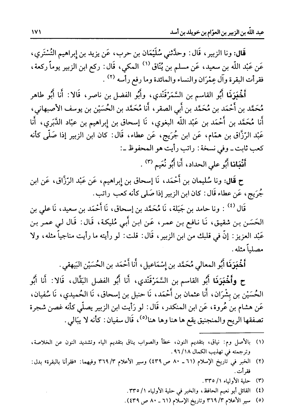 قال ونا الزبير قال وحدثني سليمان بن حرب عن يزيد بن إبراهيم التستري عن عبد الله بن سعيد عن مسلم بن يناق (1) المكي قال ركع ابن الزبير يوما ركعة فقرأت البقرة وآل عمران والنساء والمائدة وما رفع راسه (2) أخبرنا أبو القاسم بن السمرقندي وأبو الفضل بن ناصر قالا أنا أبو طاهر محمد بن أحمد بن محمد بن أبي الصقر أنا محمد بن الحسين بن يوسف الاصبهاني أنا محمد بن أحمد بن عبد الله البغوي نا إسحاق بن إبراهيم بن عباد الدبري أنا عبد الرزاق بن همام عن ابن جريج عن عطاء قال كان ابن الزبير إذا صلى كأنه كعب ثابت وفي نسخة راتب رايت هو المحفوظ انبأنا أبو علي الحداد أنا أبو نعيم (3) ح قال ونا سليمان بن أحمد نا إسحاق بن إبراهيم عن عبد الرزاق عن ابن جريج عن عطاء قال كان ابن الزبير إذا صلى كأنه كعب راتب قال (4) ونا حامد بن جبلة نا محمد بن إسحاق نا أحمد بن سعيد نا علي بن الحسن بن شقيق نا نافع بن عمر عن ابن أبي مليكة قال قال لي عمر بن عبد العزيز ان في قلبك من ابن الزبير قال قلت لو رايته ما رايت مناجيا مثله ولا مصليا مثله أخبرنا أبو المعالي محمد بن إسماعيل أنا أحمد بن الحسين البيهقي ح وأخبرنا أبو القاسم بن السمرقندي أنا أبو الفضل البقال قالا أنا أبو الحسين بن بشران أنا عثمان بن أحمد نا حنبل بن إسحاق نا الحميدي نا سفيان عن هشام بن عروة عن ابن المنكدر قال لو رايت ابن الزبير يصلي كأنه غصن شجرة تصفقها الريح والمنجنيق يقع ها هنا وها هنا (5) قال سفيان كأنه لا يبالي