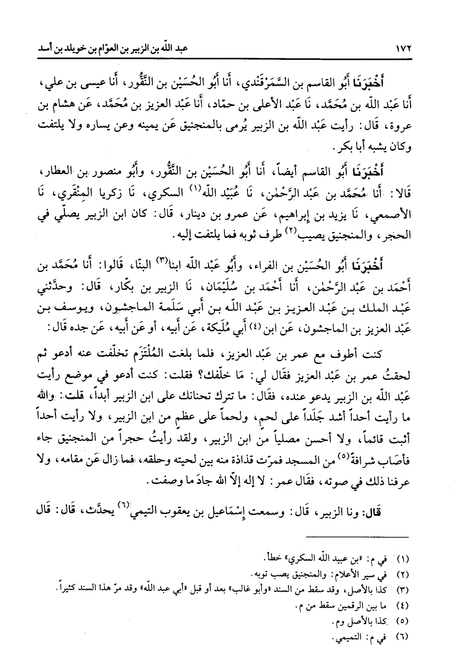 أخبرنا أبو القاسم بن السمرقندي أنا أبو الحسين بن النقور أنا عيسى بن علي أنا عبد الله بن محمد نا عبد الاعلى بن حماد أنا عبد العزيز بن محمد عن هشام بن عروة قال رايت عبد الله بن الزبير يرمى بالمنجنيق عن يمينه وعن يساره ولا يلتفت وكان يشبه أبا بكر أخبرنا أبو القاسم ايضا أنا أبو الحسين بن النقور وأبو منصور بن العطار قالا أنا محمد بن عبد الرحمن نا عبيد الله (1) السكري نا زكريا المنقري نا الاصمعي نا يزيد بن إبراهيم عن عمرو بن دينار قال كان ابن الزبير يصلي في الحجر والمنجنيق يصيب (2) طرف ثوبه فما يلتفت إليه أخبرنا أبو الحسين بن الفراء وأبو عبد الله ابنا (3) البنا قالوا أنا محمد بن أحمد بن عبد الرحمن أنا أحمد بن سليمان نا الزبير بن بكار قال وحدثني عبد الملك بن عبد العزيز بن عبد الله بن أبي سلمة الماجشون ويوسف بن عبد العزيز بن الماجشون عن ابن (4) أبي مليكة عن أبيه أو عن أبيه عن جده قال كنت اطوف مع عمر بن عبد العزيز فلما بلغت الملتزم تخلفت عنه ادعو ثم لحقت عمر بن عبد العزيز فقال لي ما خلفك فقلت كنت ادعو في موضع رايت عبد الله بن الزبير يدعو عنده فقال ما تترك تحنانك على ابن الزبير ابدا قلت والله ما رايت احدا اشد جلدا على لحم ولحما على عظم من ابن الزبير ولا رايت احدا اثبت قائما ولا احسن مصليا من ابن الزبير ولقد رايت حجرا من المنجنيق جاء فاصاب شرافة (5) من المسجد فمرت قذاذة منه بين لحيته وحلقه فما زال عن مقامه ولا عرفنا ذلك في صوته فقال عمر لا إله إلا الله جاد ما وصفت قال ونا الزبير قال وسمعت إسماعيل بن يعقوب التيمي (6) يحدث قال قال