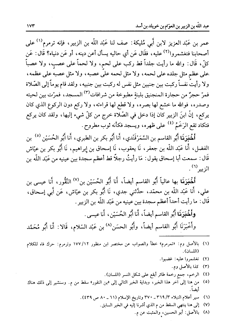 عمر بن عبد العزيز لابن أبي مليكة صف لنا عبد الله بن الزبير فانه ترمرم (1) على اصحابنا فتغشمروا (2) عليه فقال عن اي حاليه يسأل أعن دينه أو عن دنياه قال عن كل قال والله ما رايت جلدا قط ركب على لحم ولا لحما على عصب ولا عصبا على عظم مثل جلده على لحمه ولا مثل لحمه على عصبه ولا مثل عصبه على عظمه ولا رايت نفسا ركبت بين جنبين مثل نفس له ركبت بين جنبيه ولقد قام يوما إلى الصلاة فمر حجر من حجارة المنجنيق بلبنة مطبوخة من شرافات (3) المسجد فمرت بين لحيته وصدره فوالله ما خشع لها بصره ولا قطع لها قراءته ولا ركع دون الركوع الذي كان يركع ان ابن الزبير كان إذا دخل في الصلاة خرج من كل شئ إليها ولقد كان يركع فتكاد تقع الرخم (4) على ظهره ويسجد فكأنه ثوب مطروح أخبرنا أبو القاسم بن السمرقندي أنا أبو بكر بن الطبري أنا أبو الحسين (5) بن الفضل أنا عبد الله بن جعفر نا يعقوب نا إسحاق بن إبراهيم نا أبو بكر بن عياش قال سمعت أبا إسحاق يقول ما رايت رجلا قط اعظم سجدة بين عينيه من عبد الله بن الزبير (6) أخبرنا بها عاليا أبو القاسم ايضا أنا أبو الحسين بن (7) النقور أنا عيسى بن علي أنا عبد الله بن محمد حدثني جدي نا أبو بكر بن عياش عن أبي إسحاق قال ما رايت احدا اعظم سجدة بين عينيه من عبد الله بن الزبير وأخبرنا أبو القاسم ايضا أنا أبو الحسين أنا عيسى وأخبرنا أبو القاسم ايضا وأبو الحسن (8) بن عبد السلام قالا أنا أبو محمد