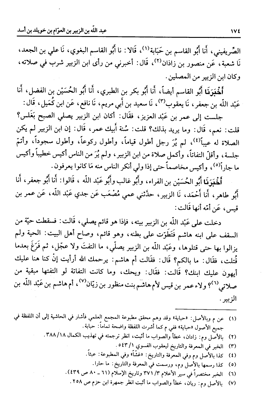 الصريفيني أنا أبو القاسم بن حبابة (1) قالا نا أبو القاسم البغوي نا علي بن الجعد نا شعبة عن منصور بن زاذان (2) قال اخبرني من راى ابن الزبير شرب في صلاته وكان ابن الزبير من المصلين أخبرنا أبو القاس ايضا أنا أبو بكر بن الطبري أنا أبو الحسين بن الفضل أنا عبد الله بن جعفر نا يعقوب نا (3) سعيد بن أبي مريم نا نافع عن ابن كميل قال جلست إلى عمر بن عبد العزيز فقال اكان ابن الزبير يصلي الصبح بغلس قلت نعم قال وما يريد بذلك قلت سنة أبيك عمر قال ان ابن الزبير لم يكن الصلاة له عيبا (4) لم ير رجل اطول قياما واطول ركوعا واطول سجودا واتم جلسة واقل التفاتا واكمل صلاة من ابن الزبير ولم ير من الناس اكيس خطيبا واكيس ما جارا (5) واكيس مخاصما حتى إذا ولي انكر الناس منه ما كانوا يعرفون أخبرنا أبو الحسين بن الفراء وأبو غالب وأبو عبد الله قالوا أنا أبو جعفر أنا أبو طاهر أنا أحمد نا الزبير حدثني عمي مصعب عن جدي عبد الله عن عمر بن قيس عن امه انها قالت دخلت على عبد الله بن الزبير بيته فإذا هو قائم يصلي قالت فسقطت حية من السقف على ابنه هاشم فتطوت على بطنه وهو قائم وصاح اهل البيت الحية ولم يزالوا بها حتى قتلوها وعبد الله بن الزبير يصلي ما التفت ولا عجل ثم فرغ بعدما قتلت فقال ما بالكم قال فقالت ام هاشم يرحمك الله ارايت ان كنا هنا عليك ايهون عليك ابنك قالت فقال ويحك وما كانت التفاته لو التفتها مبقية من صلاتي (6) ولاء عمر بن قيس لام هاشم بنت منظور بن زيان (7) ام هاشم بن عبد الله بن الزبير